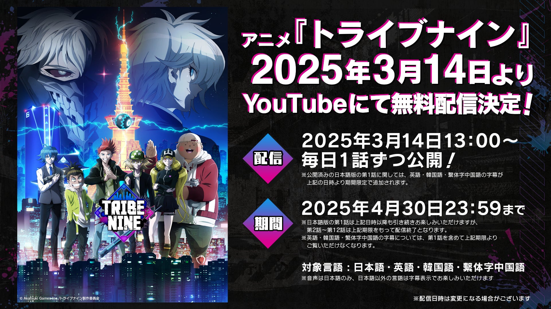 グローバルダウンロード数が1,000万を突破したことを記念し、2022年に放映されたアニメ『トライブナイン』を、2025年3月14日(金)13:00より1日1話ずつ、トライブナイン公式YouTubeチャンネル(@tribenine_tokyo)にて期間限定で無料配信いたします。