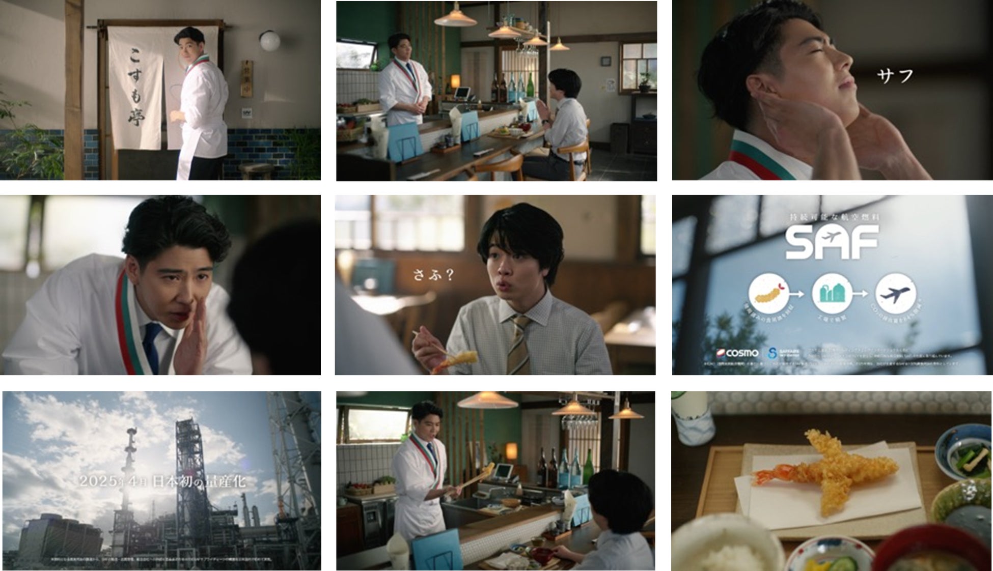 今回の新TVCMでは、賀来賢人さんが天ぷら店「こすも亭」の店主役で登場。「サクッ」という音を響かせて、揚げたての天ぷらを頬張る男性客を相手に、食用油の意外な再利用法を明かすストーリーを通じて、2025年4月、持続可能な航空燃料「SAF(サフ)」※の量産化にコスモが日本で初めて成功し、みんなの空に新エネルギーが誕生することをお伝えします。