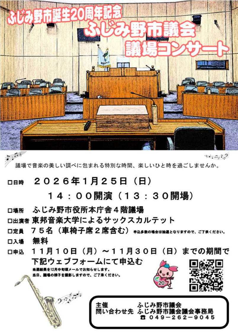 ふじみ野市誕生20周年を記念して、議場でコンサートを開催します。