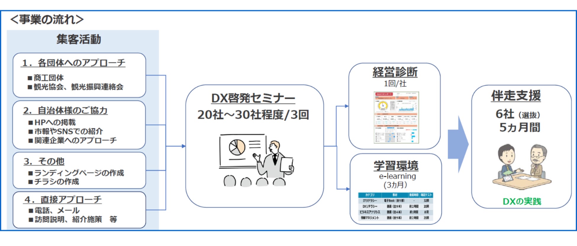 本事業は、南房総市及び館山市内の企業を対象に、デジタル化を支援し、デジタル技術を活用した業務改革(DX:デジタルトランスフォーメーション)を推進することで、地域内企業の経営改善を目指します。