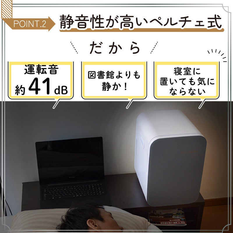 寝室に置いても運転音が気になりづらいペルチェ冷却方式を採用。