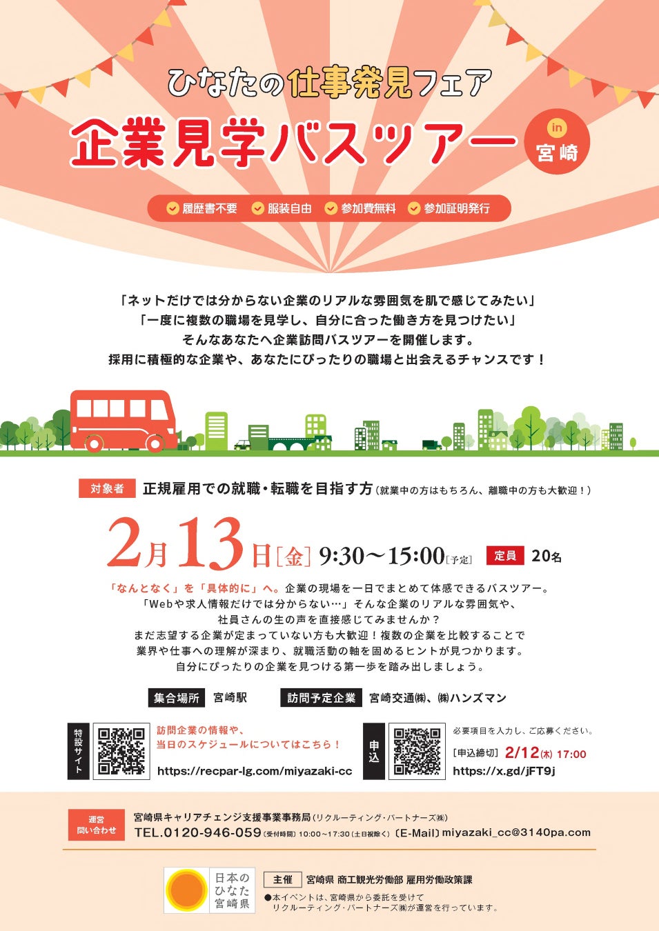 正規雇用での就職・転職を希望している方向けに「ひなたの仕事発見フェア~企業見学バスツアー&マッチングフェア~」を開催します。