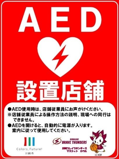 今回の協定により、川崎市内のセブン-イレブンの店舗のうち、208店舗で10月より貸出しを開始します。この度の取組にあたり、かわさきスポーツパートナーであるプロバスケットボールクラブ「川崎ブレイブサンダース」からも御協力いただき、マスコットキャラクターのロウルが入った親しみやすいAEDステッカーを新たに作成することとなりました。設置店舗の入り口付近に貼ることで、いざという時にAEDの設置場所をわかりやすく示します。