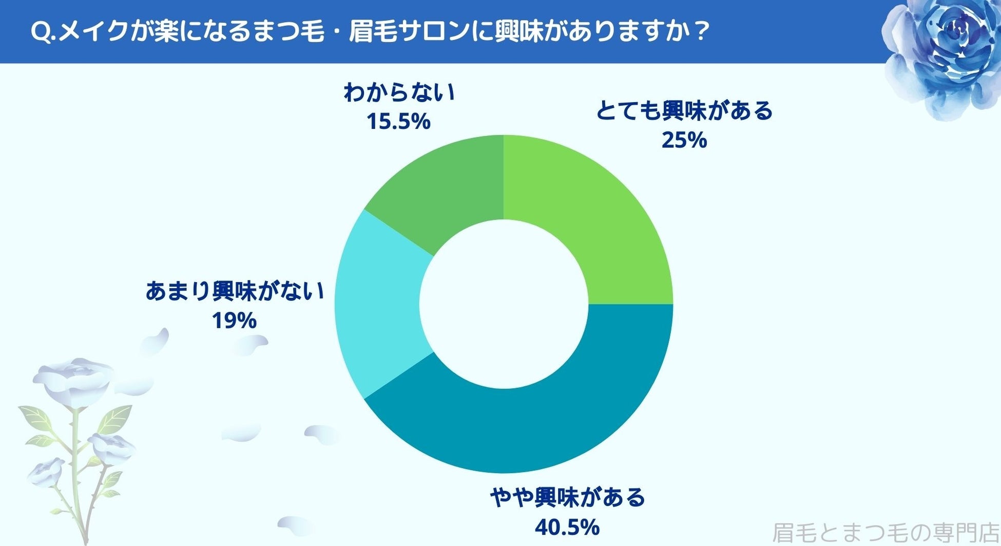 メイクが楽になるまつ毛・眉毛サロンに興味があるかお聞きしたところ「とても興味がある(25%)」、「やや興味がある(40.5%)」、「あまり興味がない(19%)」、「わからない(15.5%)」という結果になりました。