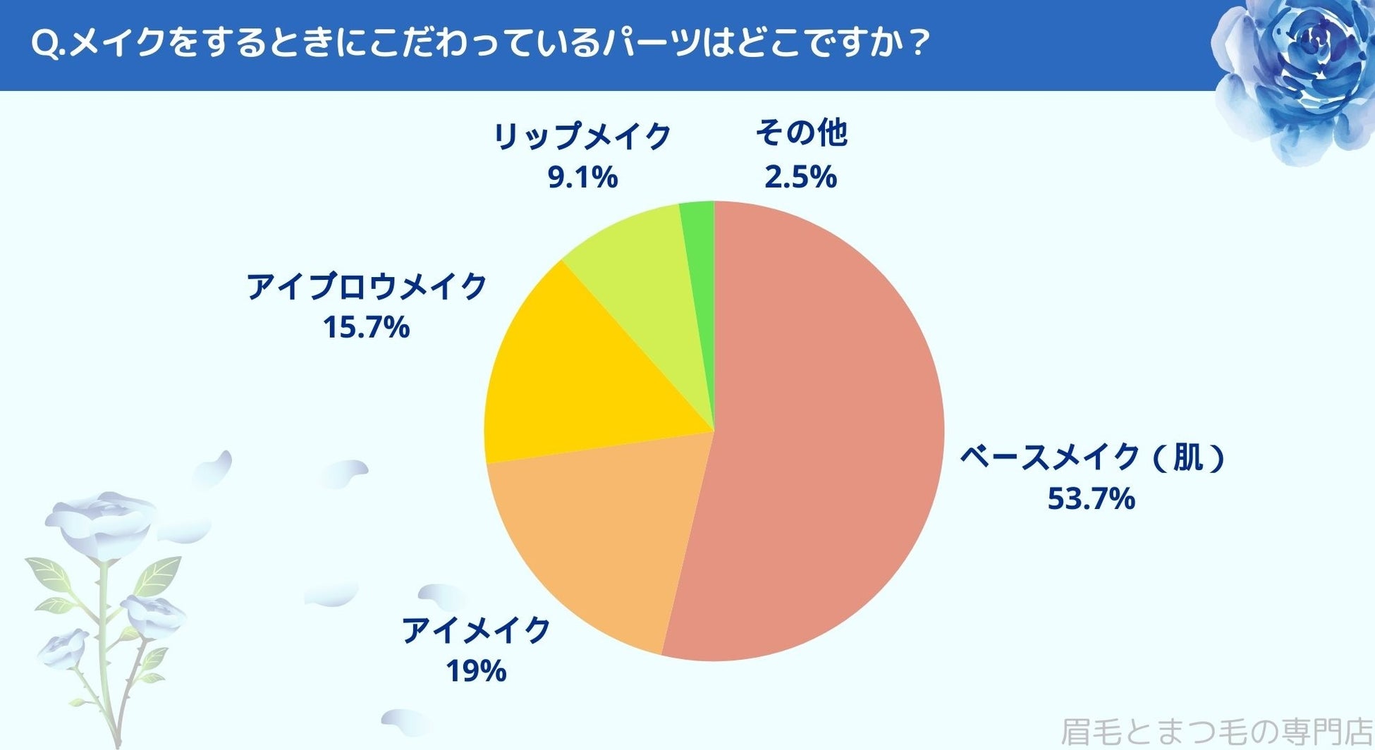 メイクをするときにこだわっているパーツをお聞きしたところ「ベースメイク(肌)(53.7%)」、「アイメイク(19%)」、「アイブロウメイク(15.7%)」、「リップメイク(9.1%)」、「その他(2.5%)」という結果になりました。