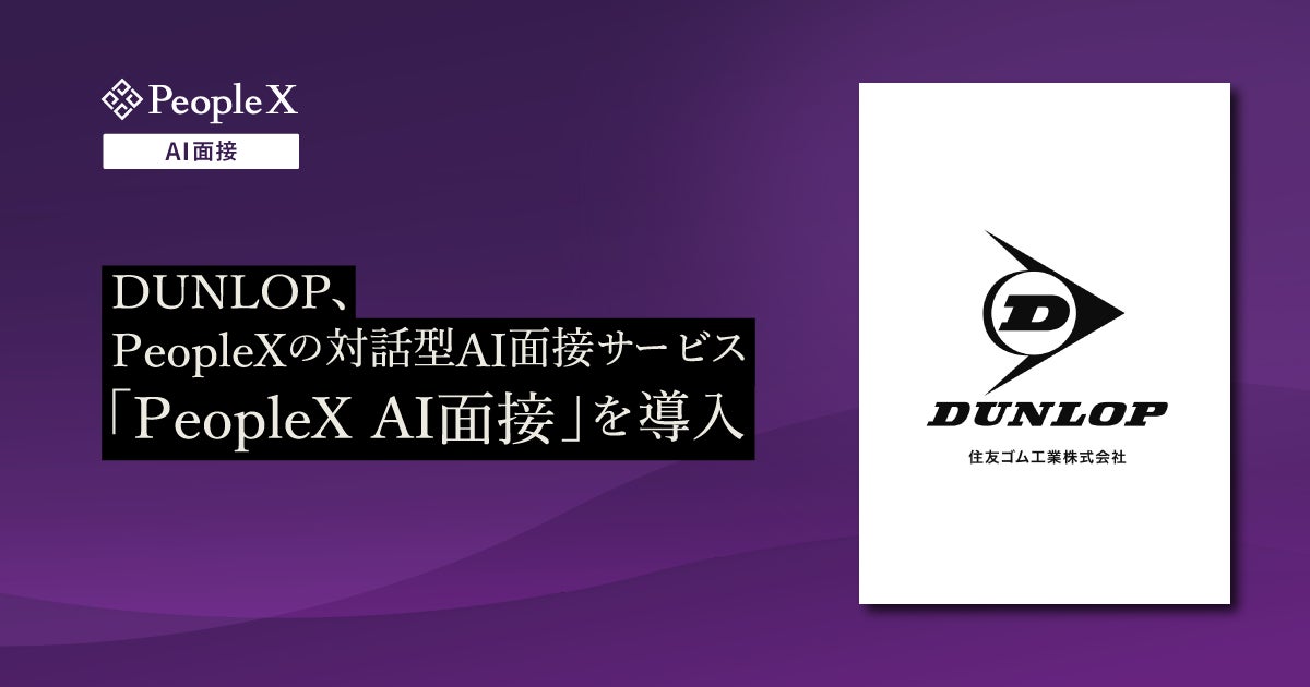 採用から活躍支援まで、AIで人事課題を解決する株式会社PeopleX(本社:東京都新宿区、代表取締役CEO:橘 大地、以下:当社)は、DUNLOP(社名:住友ゴム工業株式会社、本社:兵庫県神戸市、代表取締役社長:山本 悟)に、当社が提供する対話型AI面接サービス「PeopleX AI面接」を導入いただいたことをお知らせいたします。