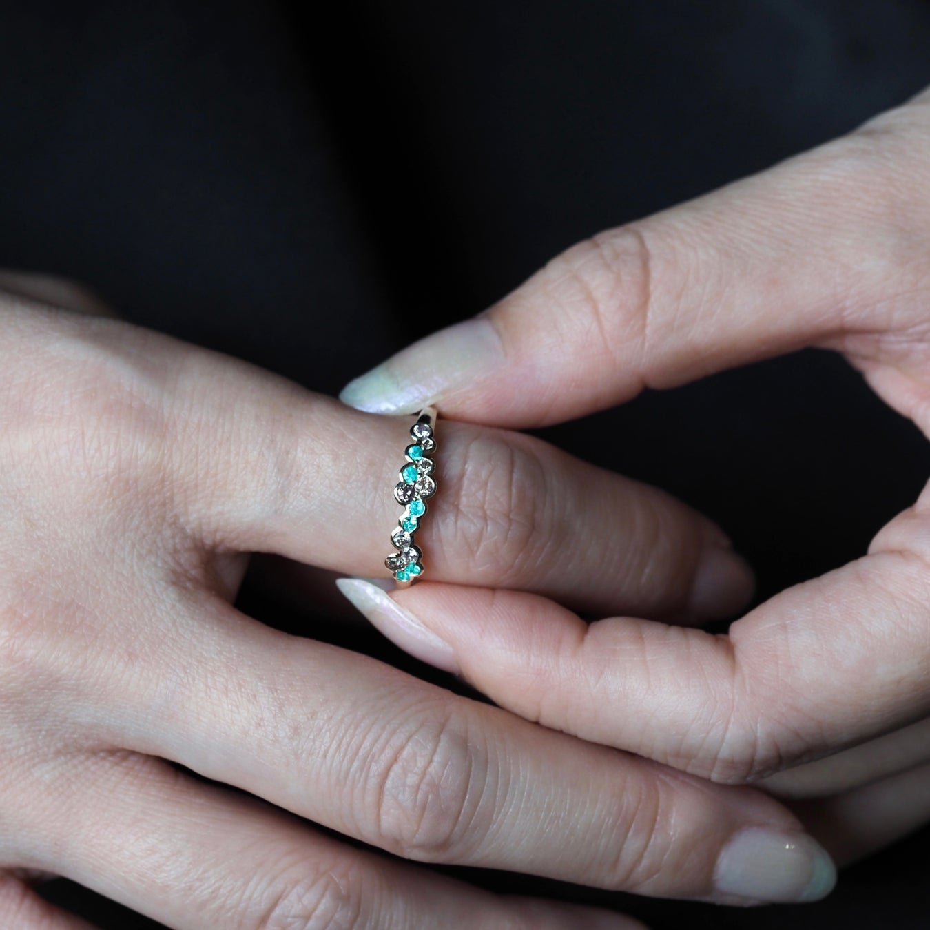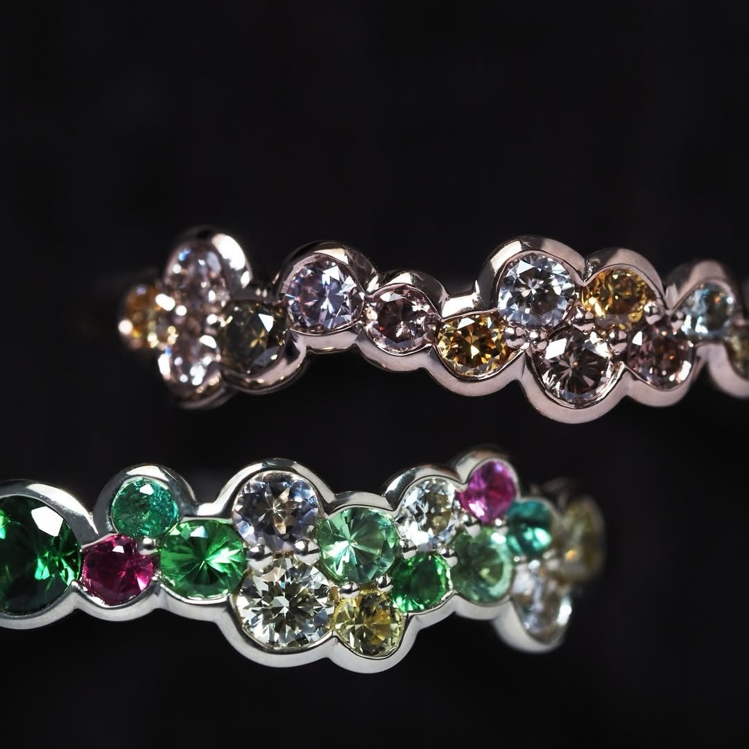 さらに、創業者兼メインデザイナーの成澤泰介(@taisuke_parcelle)がアレンジを施した特別配色も4種類ご用意しております。濃く鮮やかなブラジル産パライバトルマリン、シュシュでは初めて採用したカボションカットのデマントイドガーネット、インドで直接買い付けたザンビア産エメラルド、そしてピンクやイエローのダイヤモンドなど、希少なルースを使用した特別なラインナップです。これらはすべて現品限りとなります。