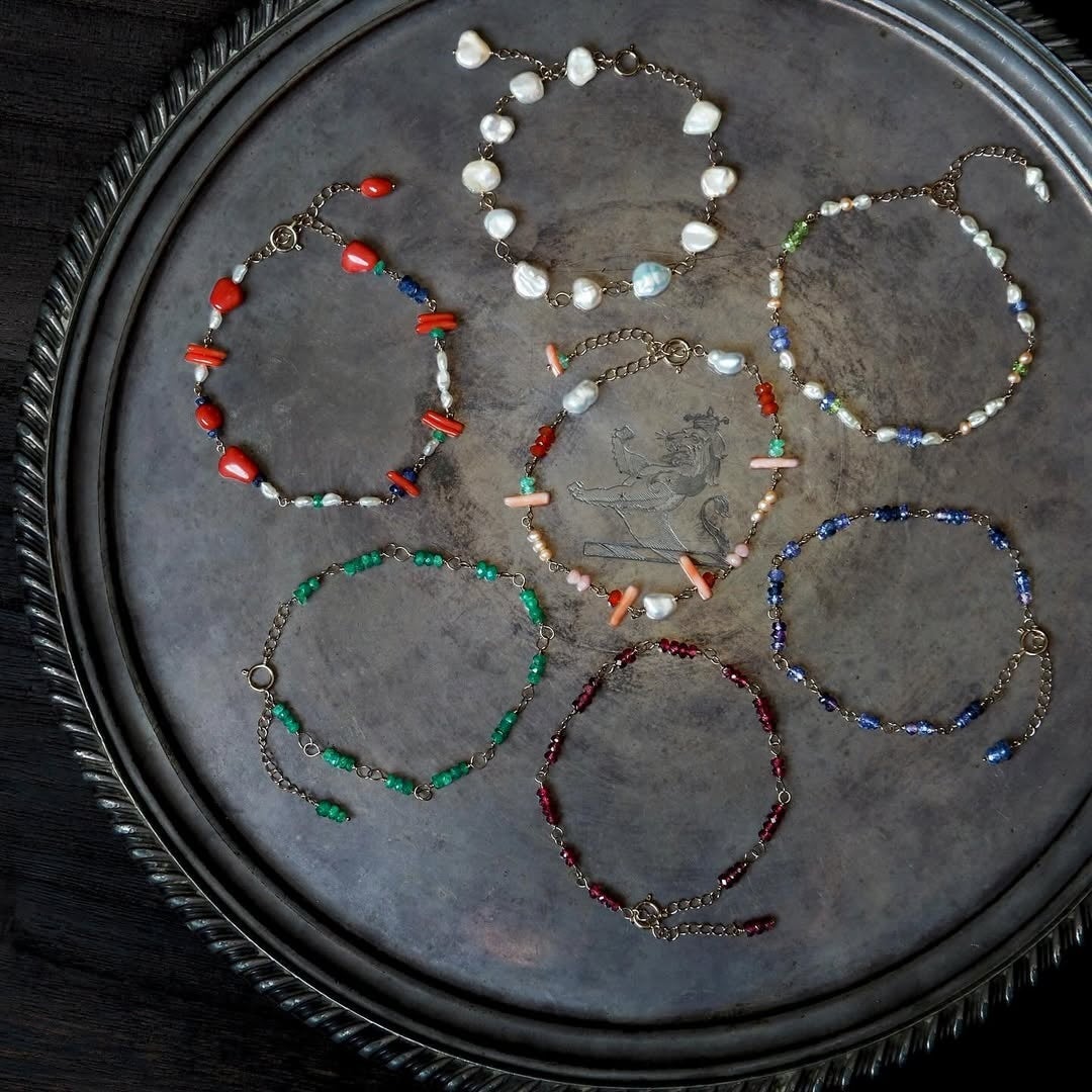 カラーストーンに真珠やサンゴを組み合わせたアレンジで、配色はすべて一点ごとに異なります。“シャンク巻き”と呼ばれる技法で、職人が金線をねじりながら一粒ずつ丁寧に留め、全体をつなぎ合わせました。金線の先端は一箇所ずつレーザーで溶接し、解けにくく、お洋服に引っかかりにくい仕様に仕上げています。細部にまで、パーセル ジュエリーらしいこだわりが込められたブレスレットです。