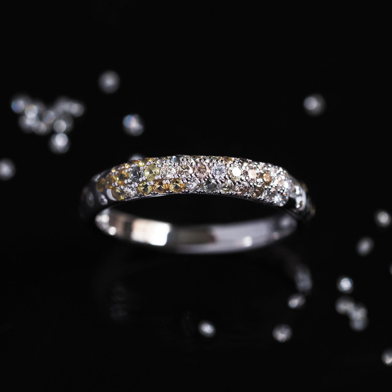 「シュシュ」は、極小の爪で宝石を一粒ずつ丁寧に留め、まるで光が指先を流れるようなパヴェの表情を描くリングです。大小異なる宝石を幅や高さまで緻密に計算して配置することで、指にすっと吸い付くような、しなやかで優雅な着け心地を実現しています。