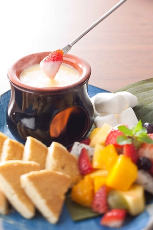 コースのラストはなんと、カスタードフォンデュでフルーツを食べ放題頂けます。完熟パインやイチゴ、キウイの他、ベビーサイズのパンケーキやマシュマロも付いてきます。お誕生日やお祝い事にもピッタリです。