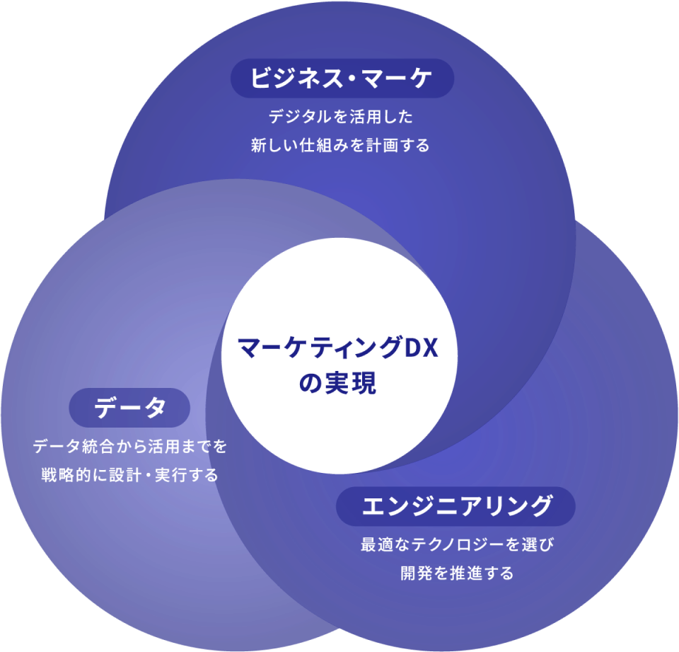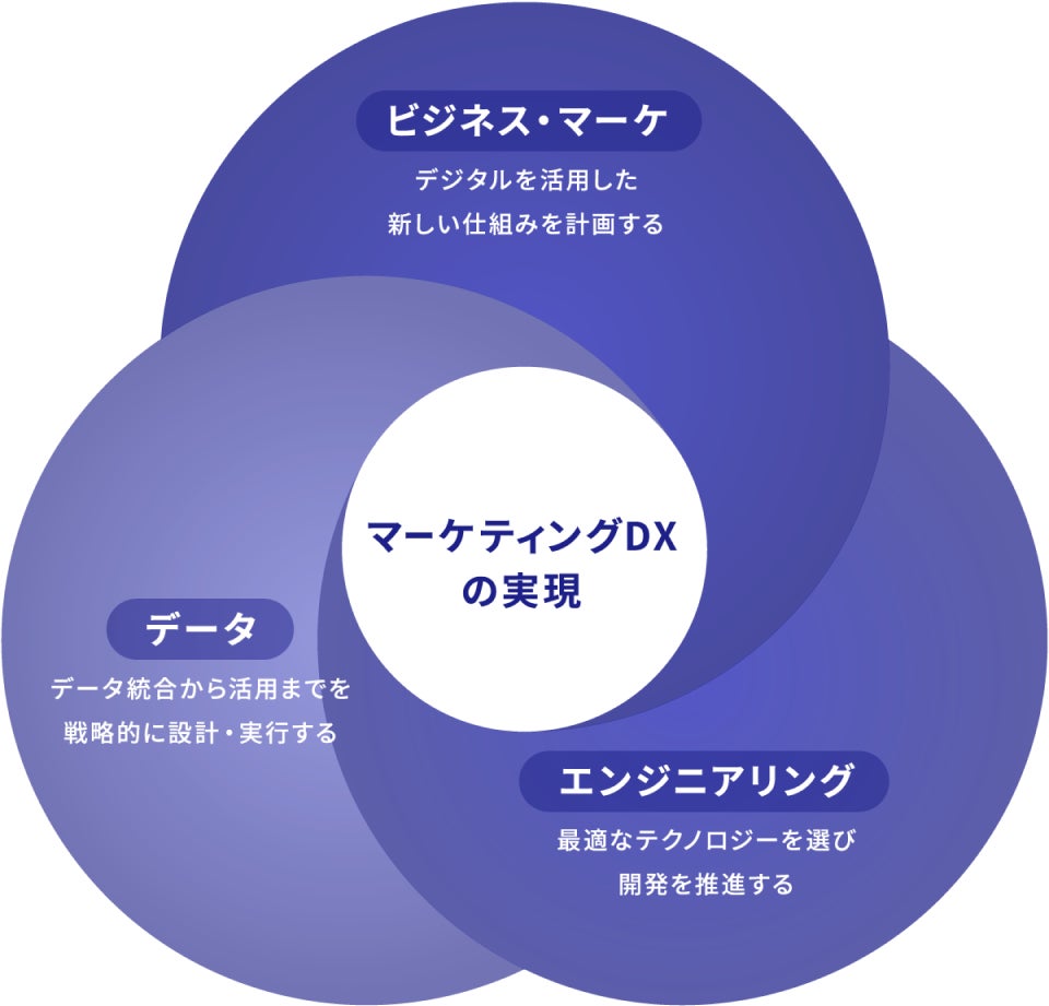ビジネス・マーケ/データ/エンジニアリング領域における高い専門性を持つプロフェッショナルたちが、お客様の"チーム"の一員となり、「飛躍的な業務変革・事業成長につながるマーケティングDX」を支援します。
