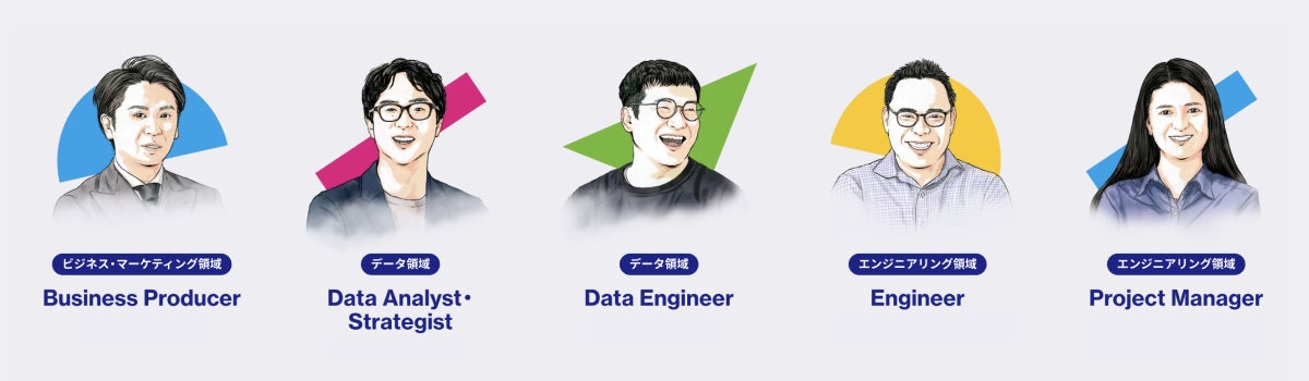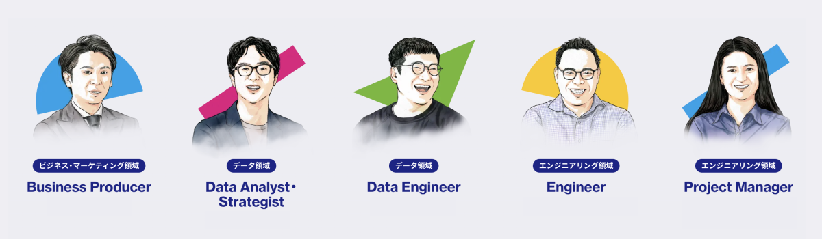 当社には、お客様のマーケティングDXを推進するため、ビジネス・マーケティング領域/データ領域/エンジニアリング領域に精通したプロフェッショナルが集まっています。