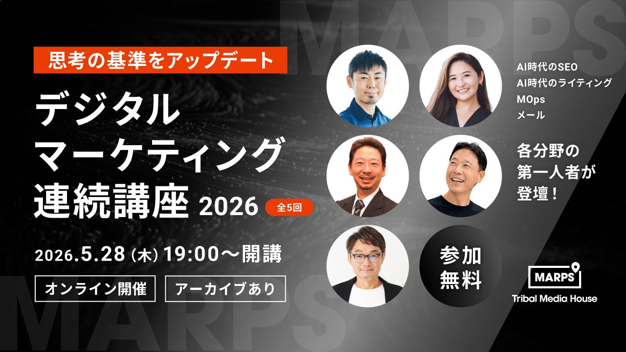 株式会社トライバルメディアハウス(本社:東京都港区、代表取締役社長:池田紀行)が運営する、マーケティングに特化したオンライン無料学習サービス「MARPS(マープス)」は、新講座『デジタルマーケティング連続講座2026〜思考の基準をアップデート〜』(全5回)を5月28日に開講します。