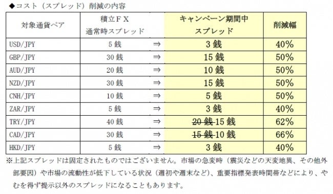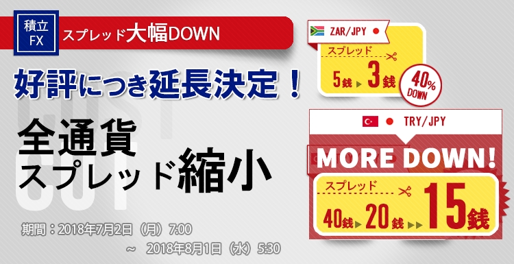 当社は「積立FX」において、最大50%のコスト削減となるスプレッド縮小キャンペーンを2018年6月4日より実施しております。今般、このキャンペーンがお客さまに大変ご好評いただいており、その中でも特にご好評を頂いておりましたトルコリラ円(TRY/JPY) 、カナダドル円(CAD/JPY)につきましては、期間中スプレッドをTRY/JPY は40銭から15銭に、CAD/JPYは30銭から10銭と更に縮小致します。