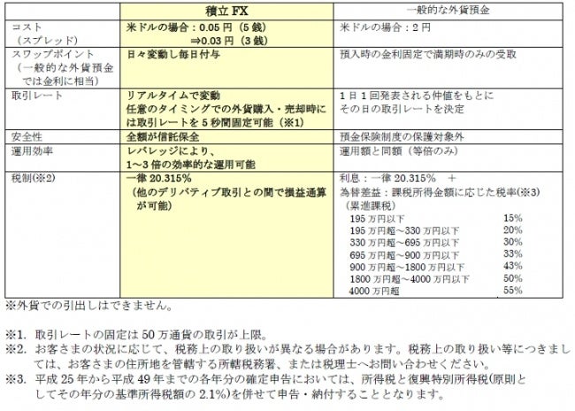 当社提供サービスの一つである「積立FX」は、一般的な外貨預金と比べ取引コストを抑え、お客さまの投資スタンスに合わせて自動購入が可能(毎日、毎週、毎月)で、定期的な長期運用を実現する画期的な商品サービスと、1通貨単位から取引ができる手軽さから、2015年12月の開始以来、お客さまに大変ご好評をいただいております。