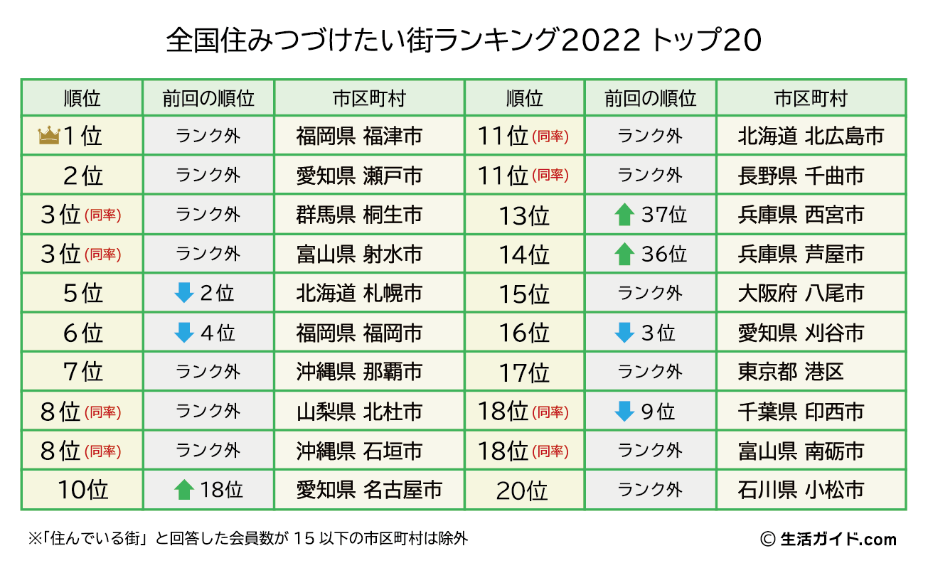 ▼全国住み続けたい街ランキング2022 上位50位まで発表