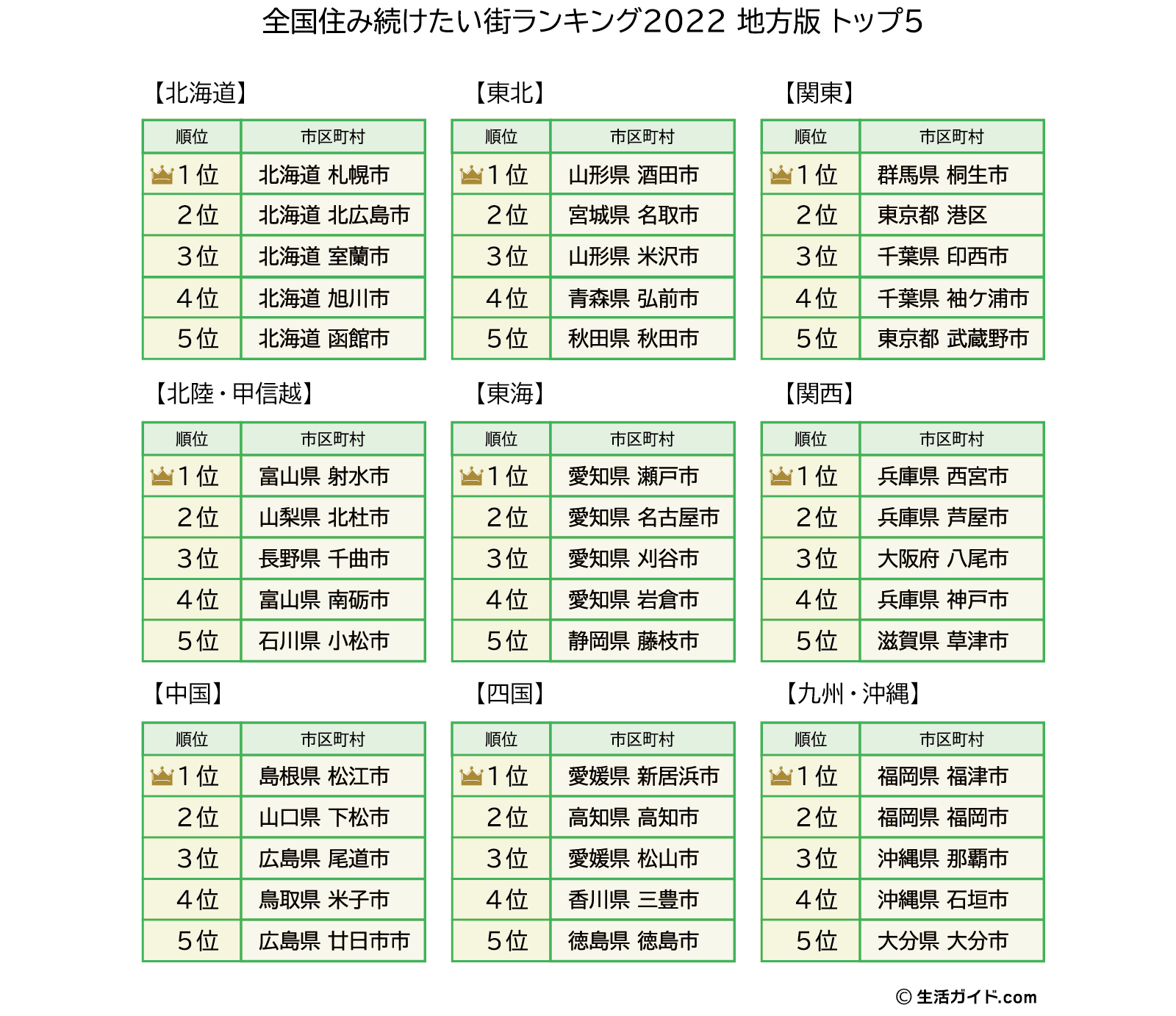 今回は、「全国住み続けたい街ランキング2022」の「地方版」のトップ5も集計しました。