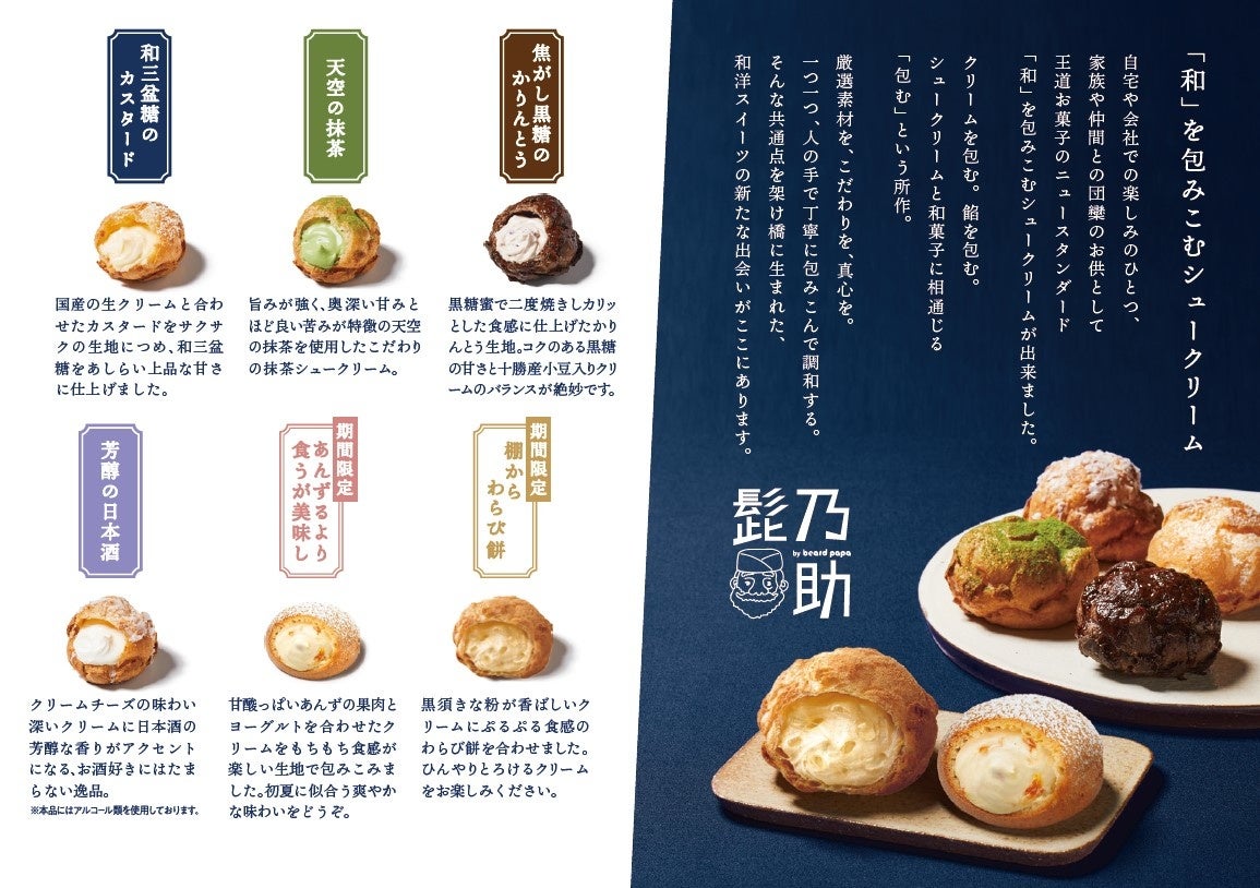 シュークリーム専門店ビアードパパを展開する、株式会社 麦の穂(本社:大阪府大阪市北区、代表取締役:杉内 健吉)は、ビアードパパから生まれた「和」を包み込むシュークリーム専門店 “髭乃助” にて、2022年4月28日(木)より2種類の初夏限定商品を販売いたします。