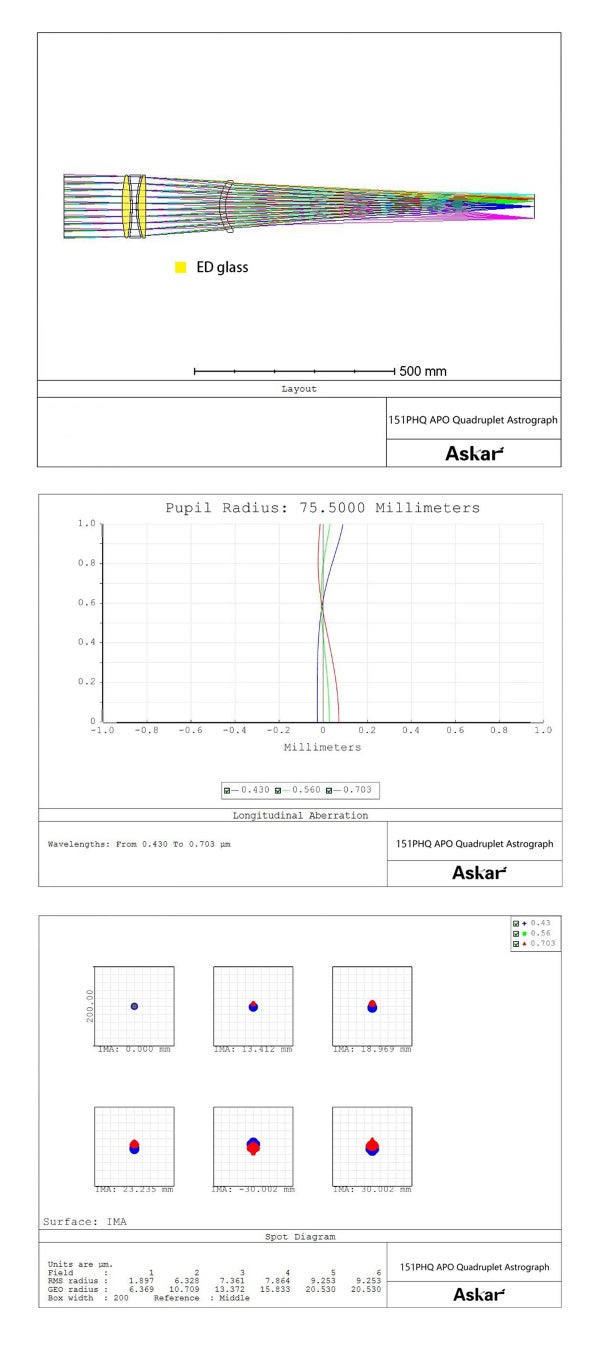 ・直径151mmの対物レンズを装備した、4群4枚のフラットフィールドEDアポクロマート鏡筒です。AskarのPHQシリーズのなかでは最大口径のフラッグシップモデルです※。