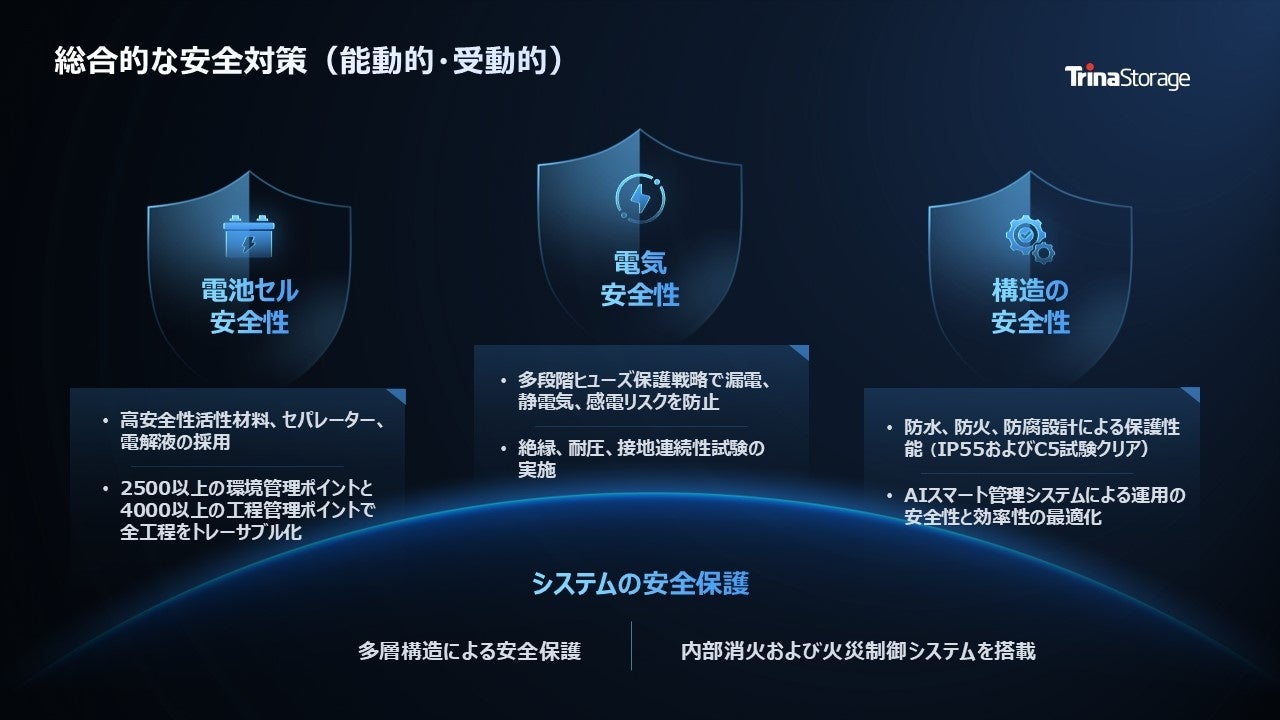 大型蓄電プロジェクトは、厳しい環境や過酷な条件下での使用が求められるため、製品の安全性と安定性が極めて重要です。トリナ・ソーラーは、電池セルからシステムに至るまで一貫した安全性を追求しています。今回の日本市場向け試験において、電池パックの性能と安全性が検証され、この理念が改めて実証されました。
