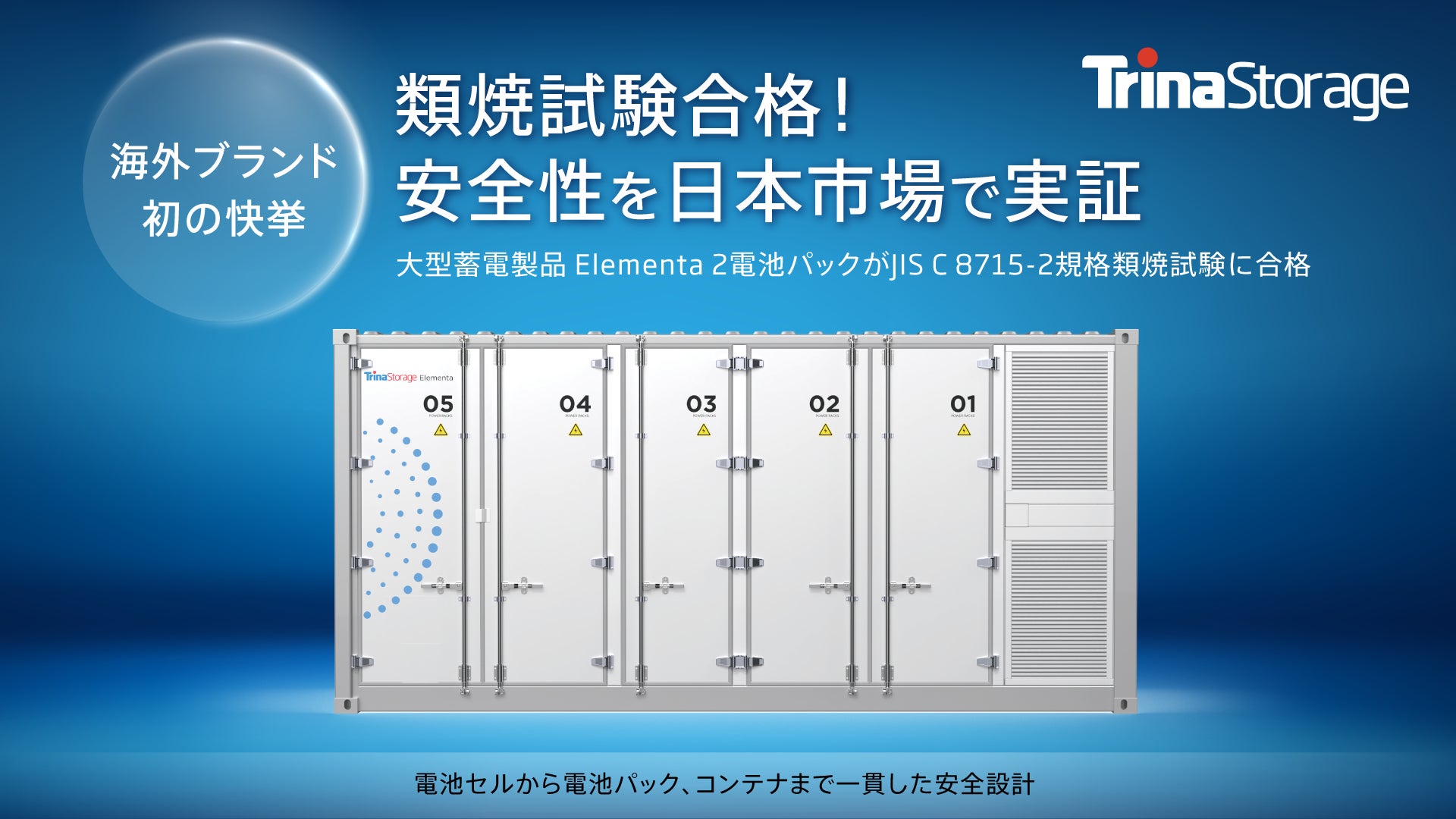世界有数のエネルギー貯蔵製品・ソリューションプロバイダーであるトリナ・ストレージは、大型蓄電製品であるElementa 2電池パックが、日本電気安全環境研究所(JET)によるJIS C 8715-2:2019規格に基づく厳格な認証試験に合格したことを発表しました。この結果、トリナ・ソーラーは日本の産業用蓄電市場において、この認証を取得した初の海外企業となりました。これにより、同製品の安全性と信頼性が改めて証明されました。