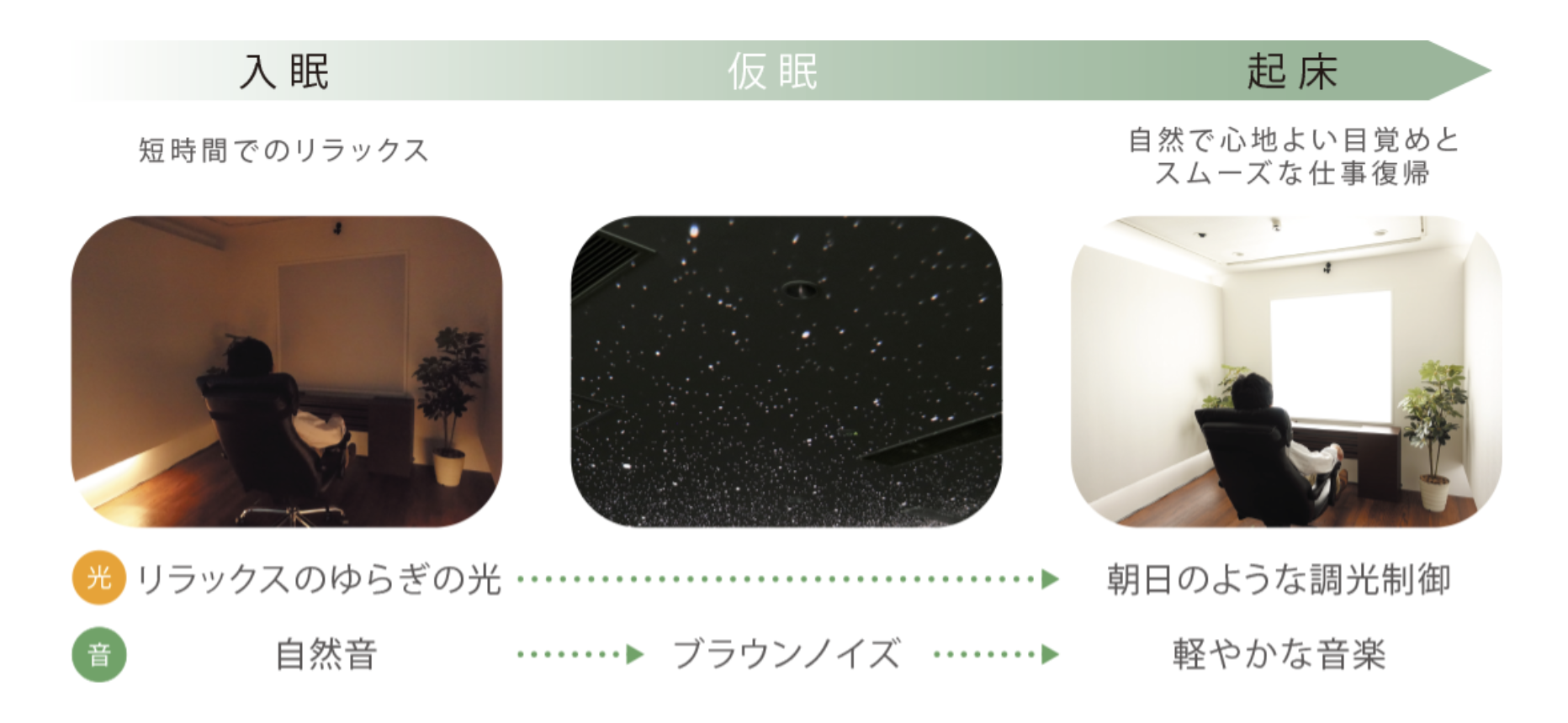 室内全体でパワーナップに適した光と音の強調制御を行い、入眠時のリラックスを促す天井の星空投影やアロマの香りなどで、快適で効率的な仮眠環境をコーディネートしています。30度の傾斜をつけたリラクシングソファや、椅子に座って仮眠をとるスペースも設け、パワーナップピロー「konemuri+」などで座位姿勢の眠りもサポートします。
