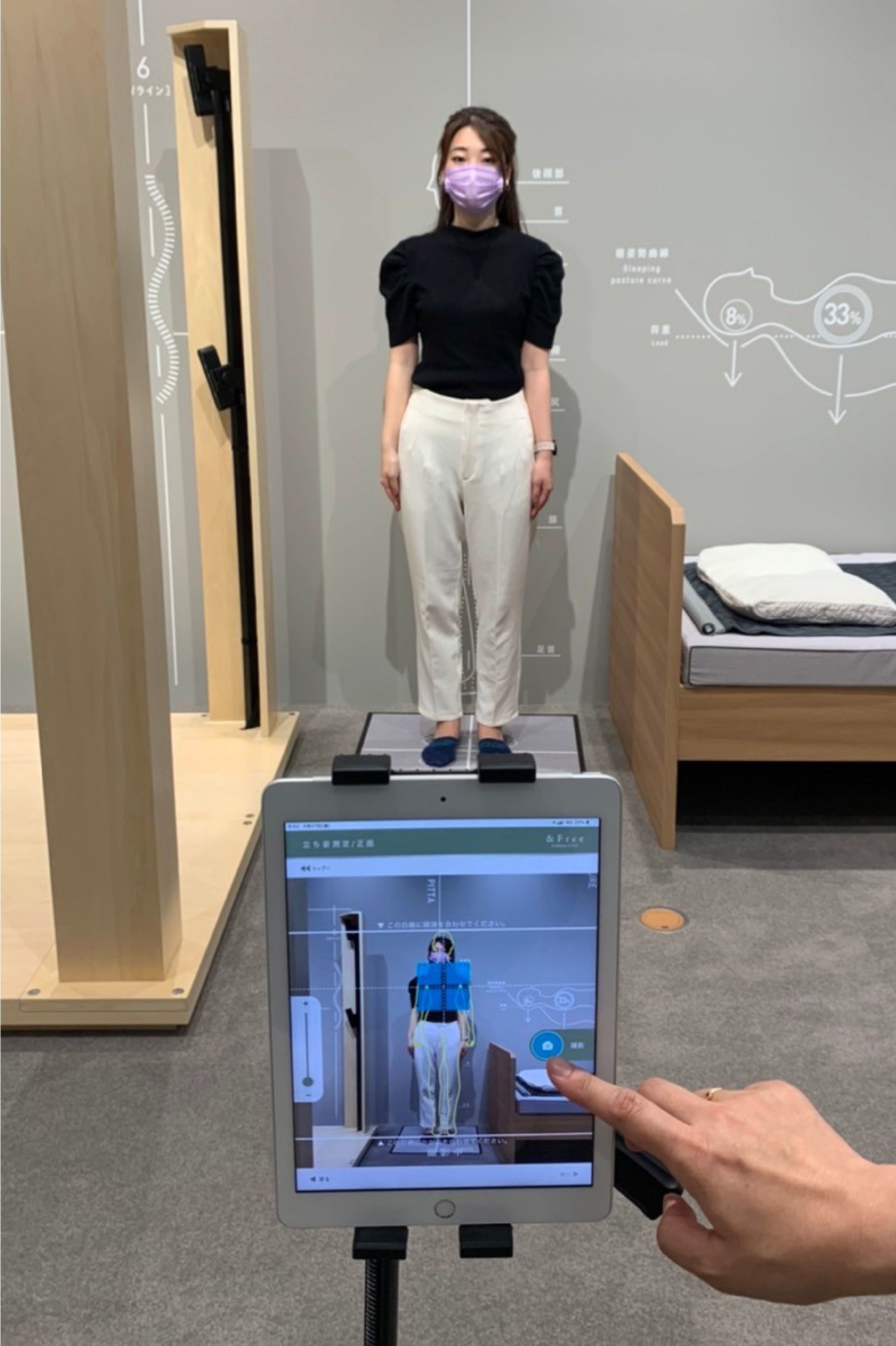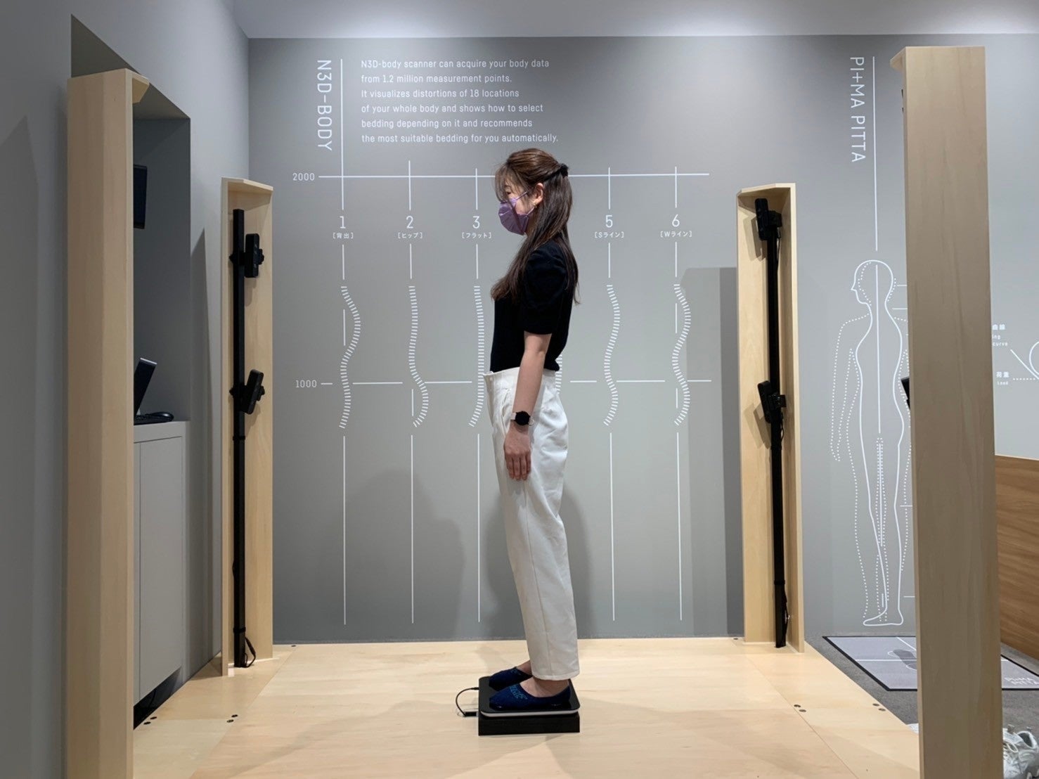3Dボディスキャナーで全身を測定し、体の骨格と歪みを可視化。データに基づき、体型に合った寝具を提案。