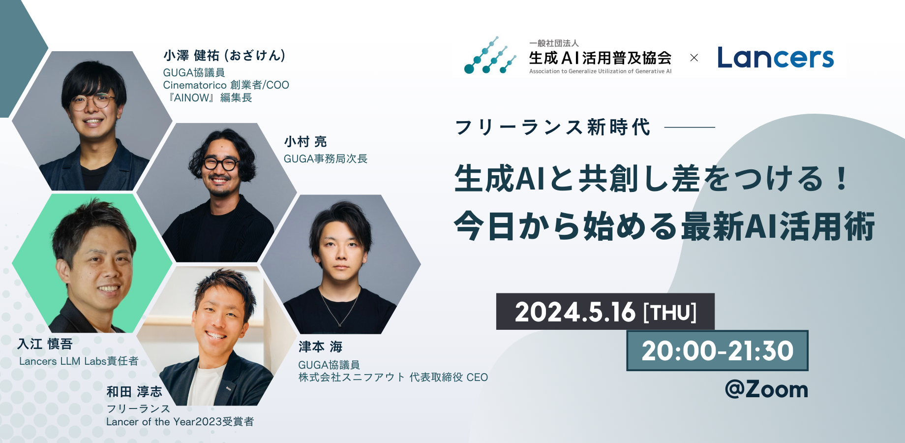 ・イベント名:【フリーランス新時代】生成AIと共創し差をつける!今日から始める最新AI活用術 ・日時:5月16日(木)20:00~21:30 ・会場:オンライン配信(Zoom予定) |