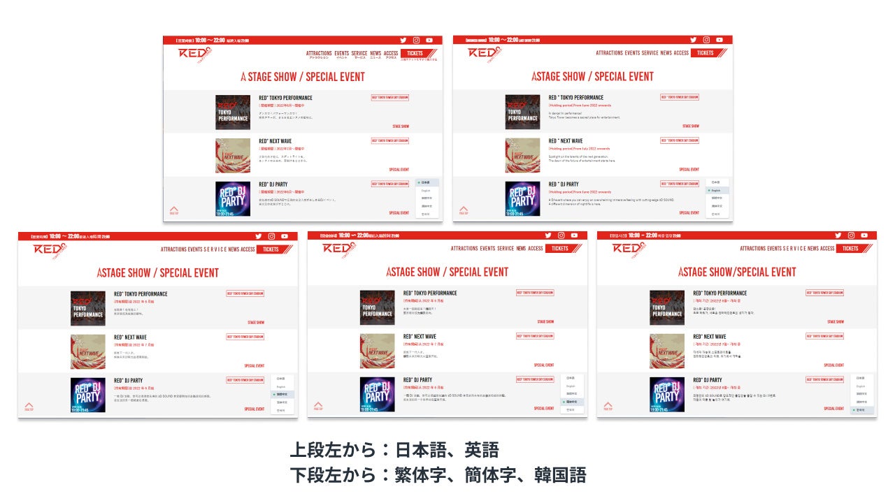 RED° TOKYO TOWER の公式 HP を、アジア圏をはじめとした外国人のお客様に伝えられるよう、英語、中国語(簡体字)、中国語(繁体字)、韓国語の4言語で公開しています。RED° TOKYO TOWER 各フロアに常設されているアトラクションの情報や、期間限定で開催されるイベント情報を、訪日される外国人のお客様にもタイムリーに伝わるように多言語で発信します。