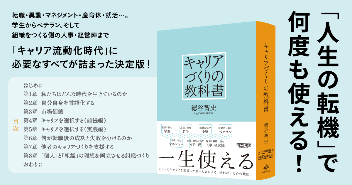 終身雇用制度は崩れ「会社が個人を守ってくれる」時代は終わりました。しかし、「キャリアのつくり方」は会社でも学校でも教えられることはありません。2万人のキャリアを支援してきたエッグフォワード代表の徳谷智史氏による、「キャリア流動化時代」で働くために必要なすべてが詰まった決定版です。転職・就活など「個人のキャリア」に関する悩みはもちろん、メンバーのキャリア支援や採用・離職に悩む経営陣や人事職にも寄り添った具体的で実践的な一冊になっています。