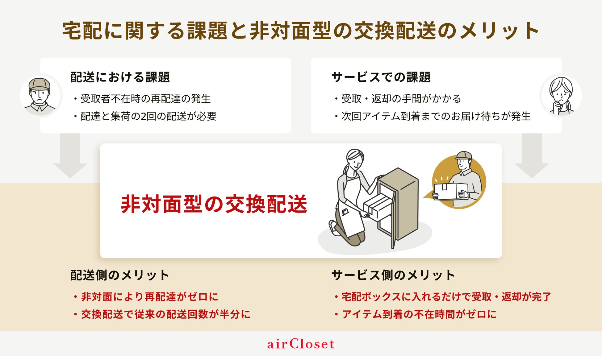 株式会社エアークローゼット(本社:東京都港区、代表取締役社長 兼 CEO:天沼 聰)は、三菱商事株式会社様(本社:東京都千代田区、代表取締役社長:中西 勝也)、パナソニック ハウジングソリューションズ株式会社様(本社:大阪府門真市、代表取締役社長:山田 昌司)、SBS即配サポート株式会社様(本社:東京都江東区、代表取締役:鎌田 正彦)とともに、宅配ボックスを活用した非対面型交換配送の実証実験を2024年2月1日より開始します。本実証実験には、大きく2つの狙いがあり、ひとつは交換型レンタルサービスにおける利便性の向上、もうひとつは「物流2024年問題」における再配達の低減です。