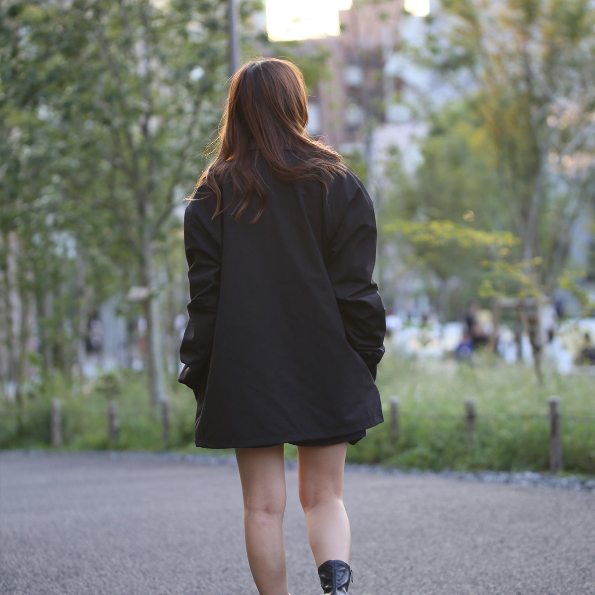 ポケットの形状も左右非対称で、ファスナーを片側のみのレイアウトにすることで着用しやすく、着る人にもやさしいデザインを目指しています。 素材は、撥水ポリエステル。張りのある素材と裏地を採用し、ライトアウターとして仕立て上げました。