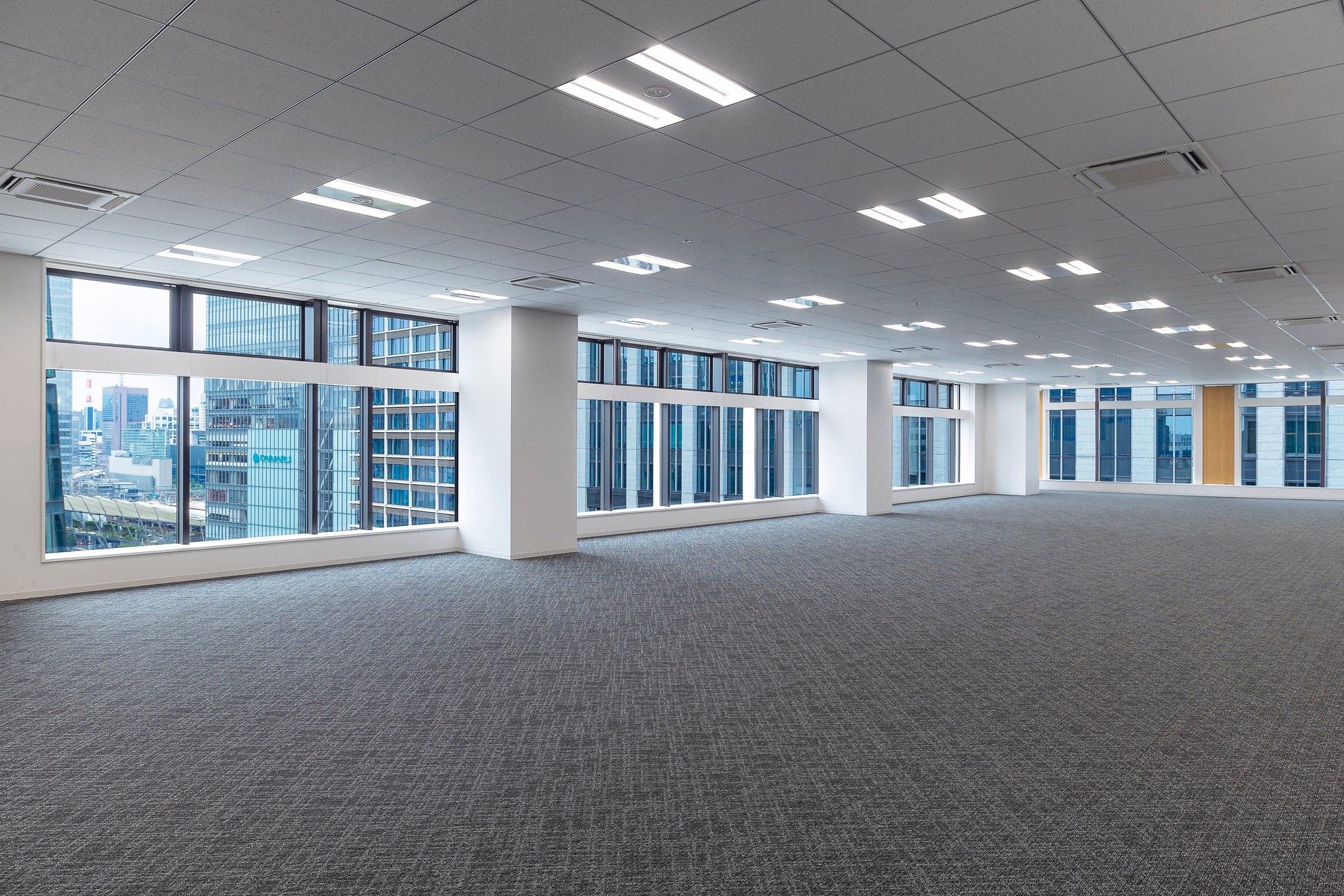 本物件は、人と環境への配慮が充実しています。夏場の直射日光を抑制する「軒」や、高断熱と遮熱を両立したLow-E複層ガラスを採用しています。ほかにも、専有部は開放感のある整形の無柱空間で、自由なレイアウトを可能にするグリッド式システム天井や、CO2削減を考慮した個別空調とLED照明ゾーニング、自然光活用で省エネに貢献するライトシェルフ、光を贅沢に取り込む南と西面の2面採光、外気を手軽に取り入れられる手動開閉可能な自然換気窓、コミュニケーションを育むオープンパントリーなど、「つながる機能」を付加し、ビジネスに多様な価値を創出します。