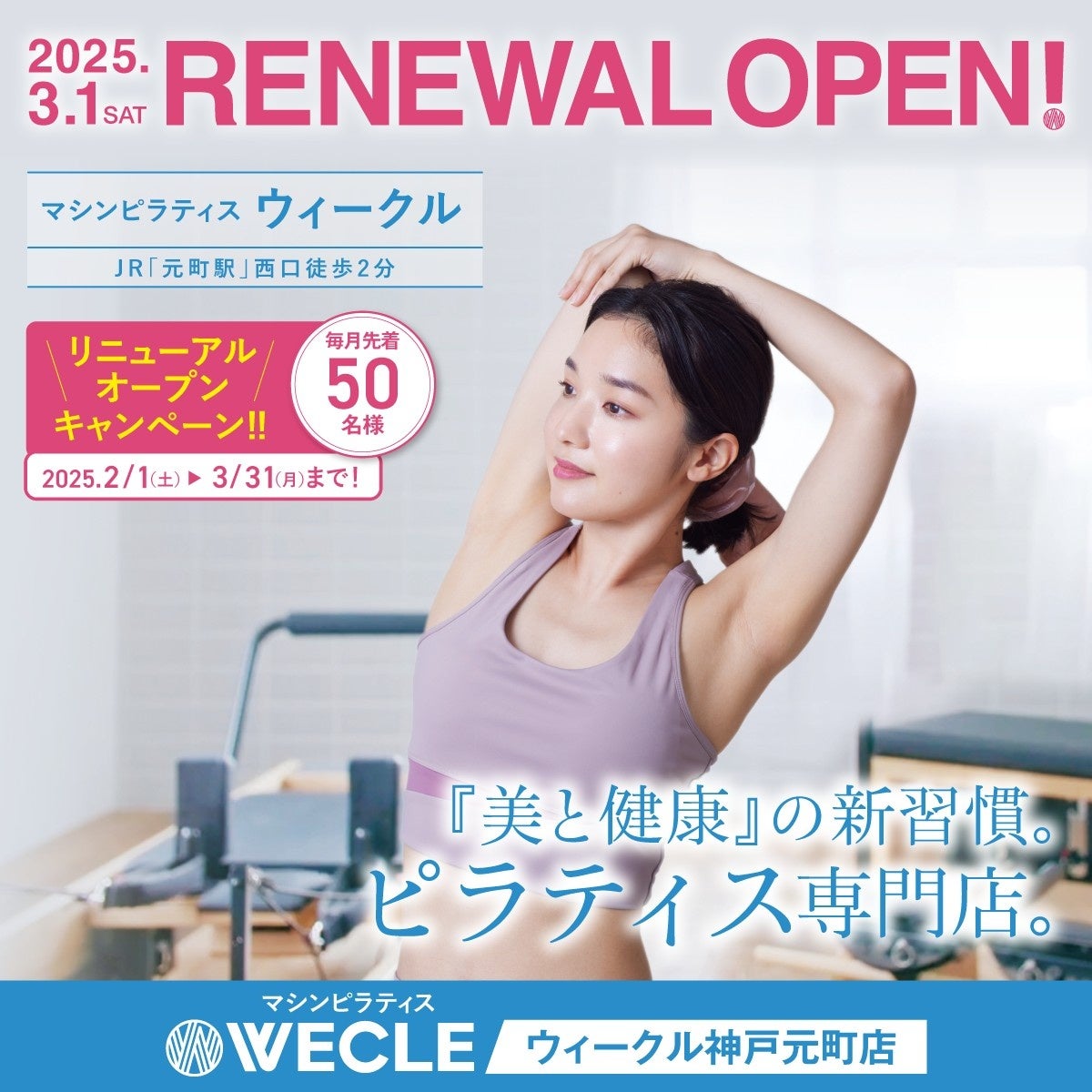 30分ピラティスの「WECLE(ウィークル)」神戸元町店が3月1日リニューアルオープン!3月31日(土)まで“各月”先着50名様限定でお得なキャンペーンを実施中!