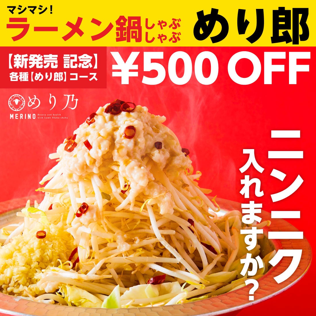 【裏めり乃始動】ごめんなさい健康志向やめました。ニンニク入れますか?背徳感満載な待望の新作鍋【めり郎】の提供を5/16(火)より開始いたします。500円引きキャンペーンを5/16~21の期間限定で実施
