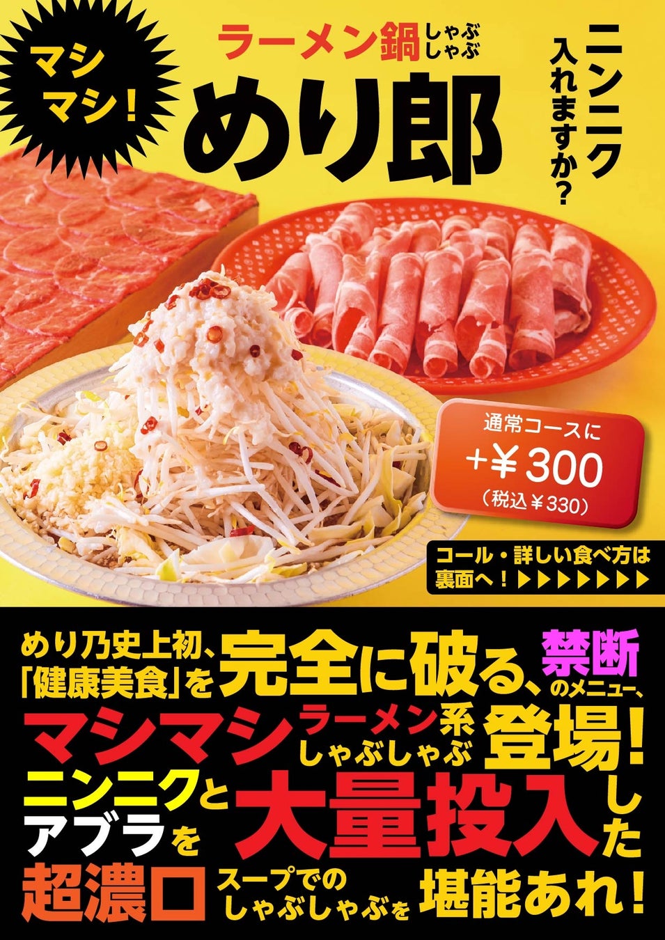 お待たせいたしました!ニンニク、ヤサイ、アブラ、カラメマシマシ!待望の新作鍋【めり郎】提供開始!