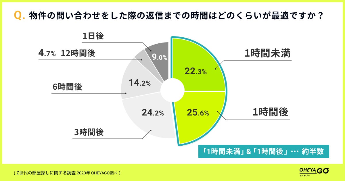 - 物件の問い合わせから返信までの時間、約半数が1時間後までが最適と回答