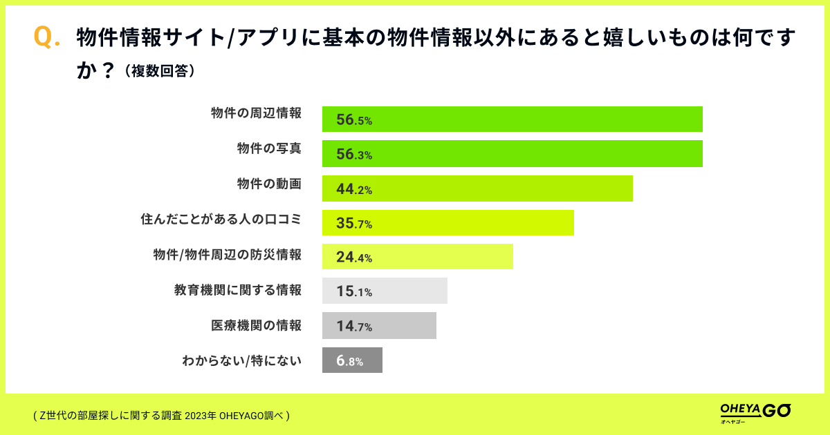 物件情報サイト/アプリに基本の物件情報以外にあると嬉しいものを質問したところ、「物件の周辺情報」と「物件写真」が約57%で最多に。3位に「物件の動画」となりました。