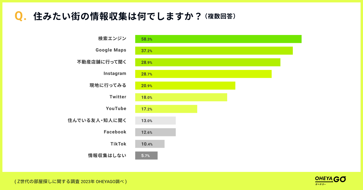 - 住みたい街の情報収集手段、検索エンジンに次いでGoogleマップ、インスタグラム、店舗訪問