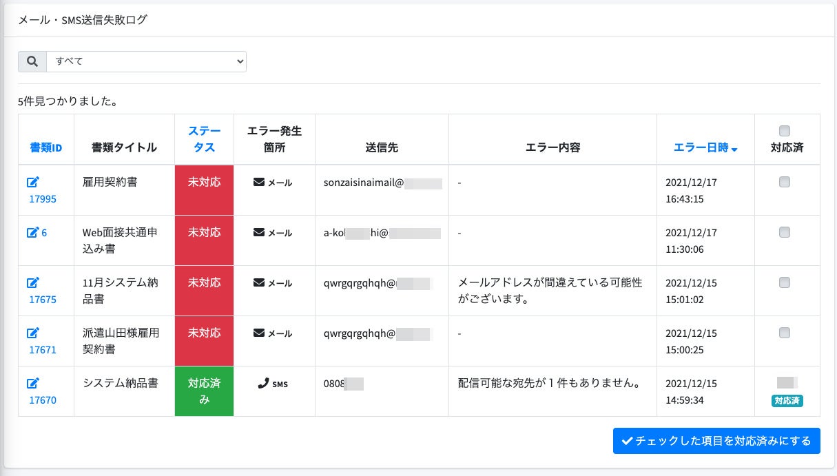 ただし、まれに誤ったメールアドレスや携帯電話番号などを登録してしまい配信に失敗することがあります。今回はこの問題に対応するため、配信に失敗したメールやSMSを管理画面からひと目で確認できるようにし、万が一応募者さまに対してメールやSMSの配信に失敗した場合でも、管理画面から確認のうえ再送することでより確実に契約書を届けることが出来るようになりました。