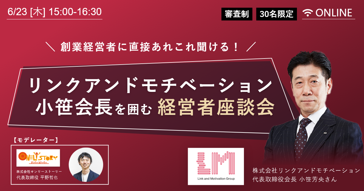 審査制・決裁者マッチング支援SaaS「ONLY STORY」「チラCEO」(https://onlystory.co.jp/service/)を運営する株式会社オンリーストーリー(代表取締役:平野哲也、本社:東京都渋谷区)は、株式会社リンクアンドモチベーションの代表取締役会長を務める小笹芳央氏をお招きし「審査制・経営者座談会」を開催することをお知らせいたします。