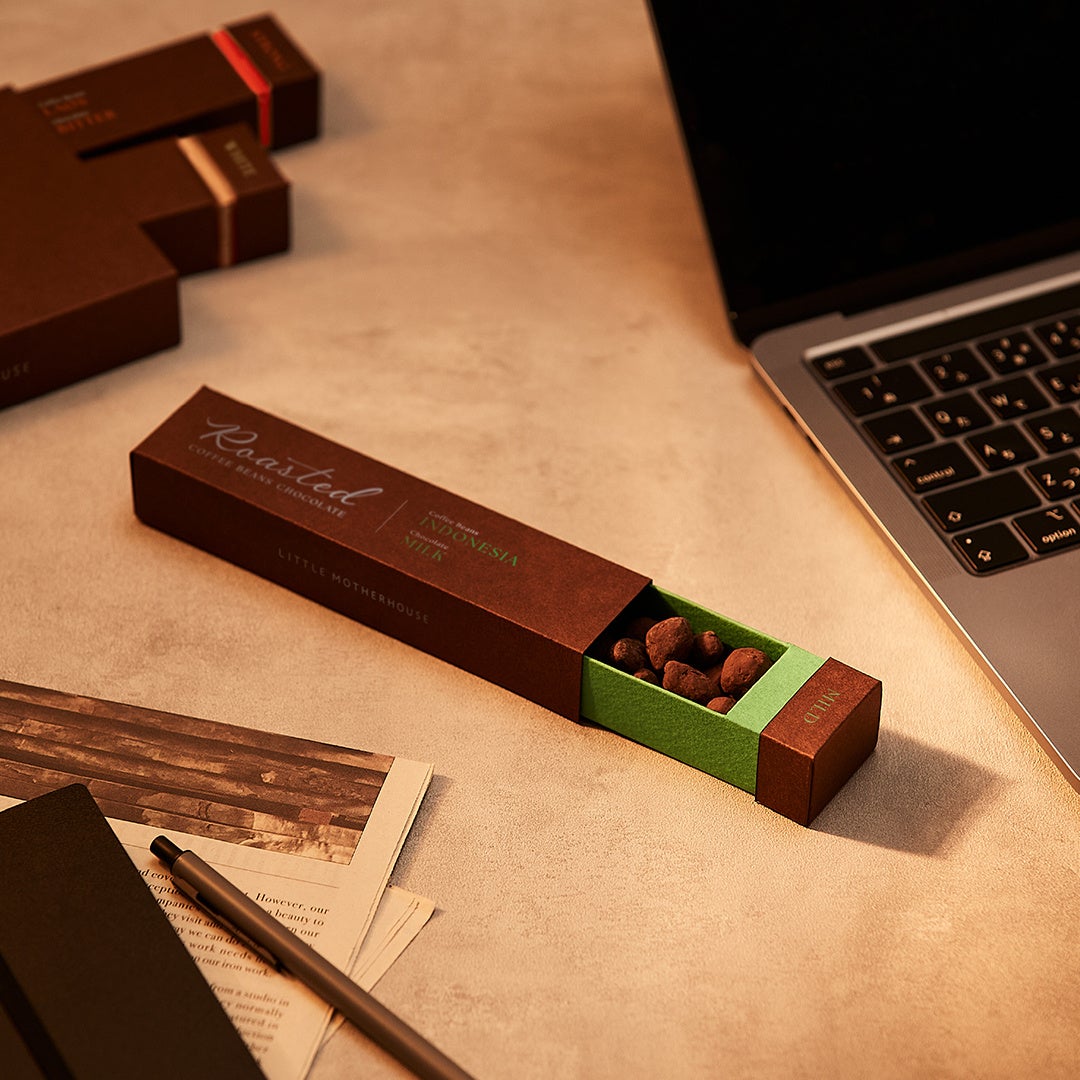 手作業でコーティングされたチョコレートと、そのチョコレートと相性の良い厳選されたコーヒー豆。ひと粒かじると口の中で豆が弾け、コーヒー豆の豊かな香りとチョコレートのやさしい甘みが一気に広がります。一日の疲れを癒したい午後のひとときや、リフレッシュにぴったりです。