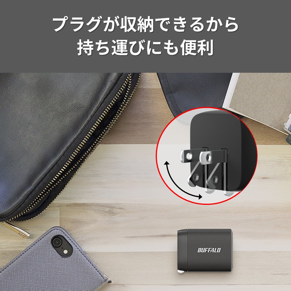 本商品はGaN(窒化ガリウム)を採用したことにより小型・軽量化を実現したUSB AC充電器です。隣のコンセントに干渉しにくいコンパクト&スリム設計で、使用しない時は電源プラグを充電器本体に収納できるので、外出や出張などの際の持ち運びに便利です。