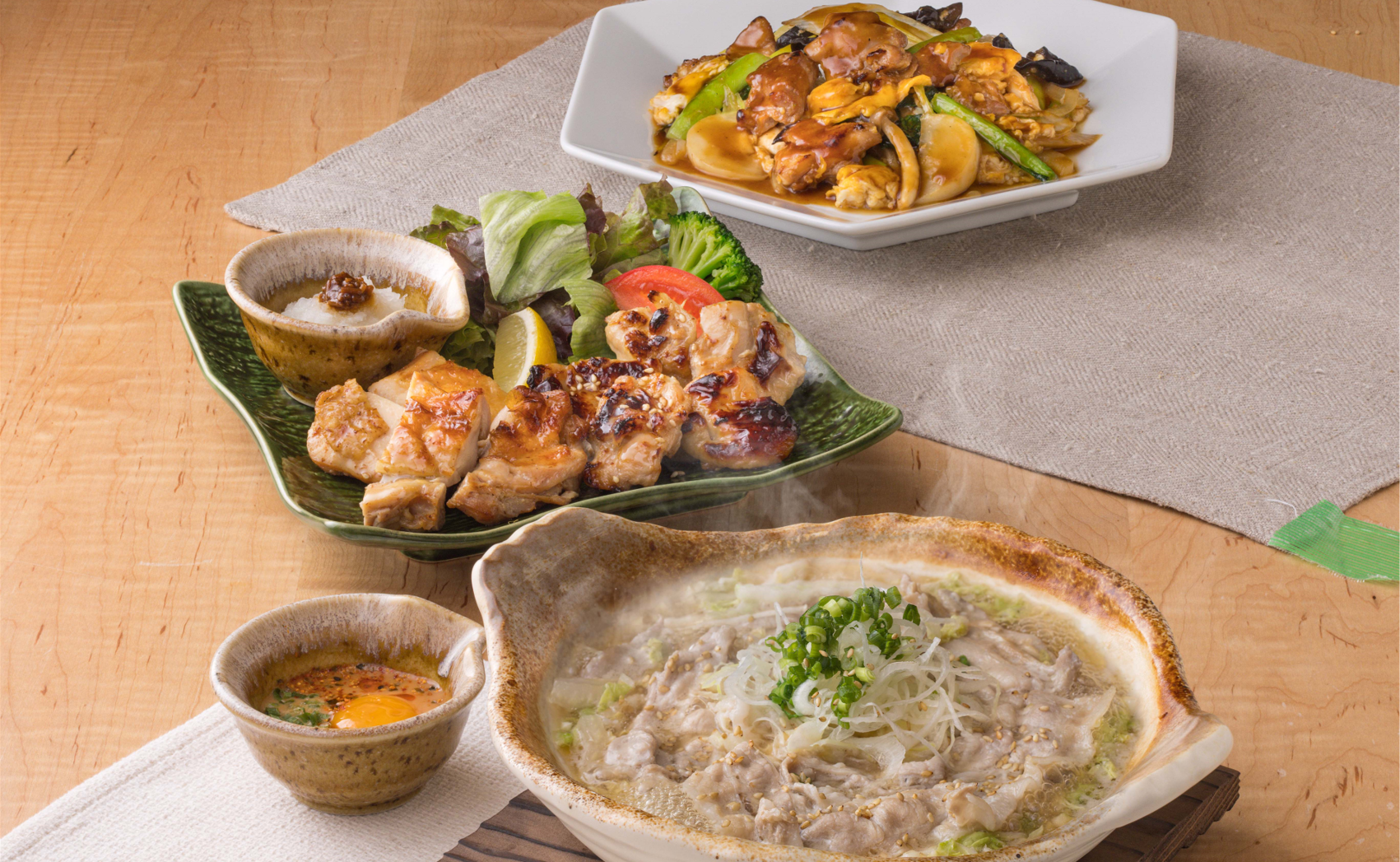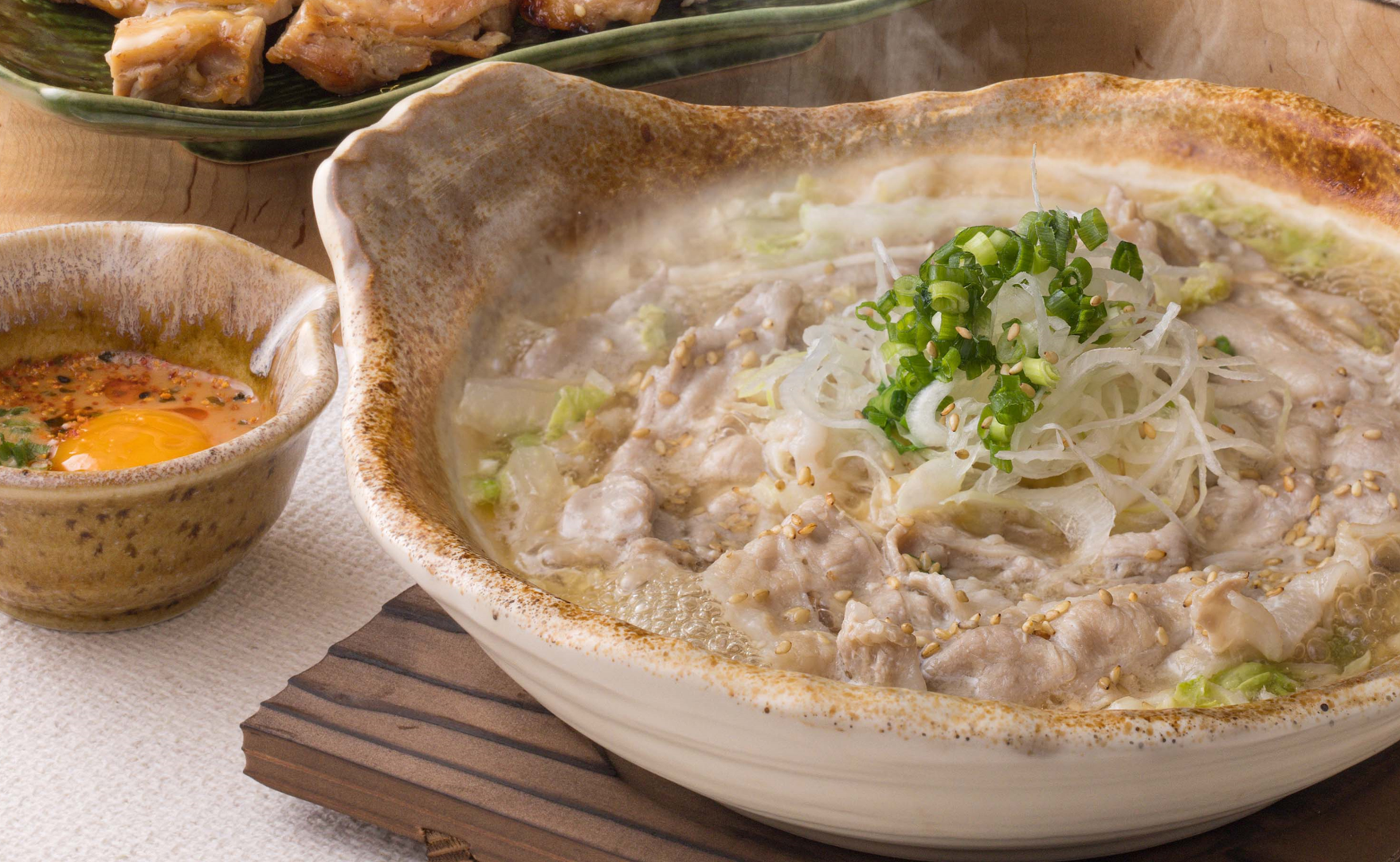 塩麹に漬け込んだ柔らかい豚肉とシャキシャキ白菜を使用した、体が芯から温まる土鍋定食です。さっぱりとやさしい味付けで年末年始の疲れたカラダを整えるにはピッタリ。卵黄入りの特製辛みそダレは濃厚で辛味が効いていますのでお好みでかけてお召し上がりください。