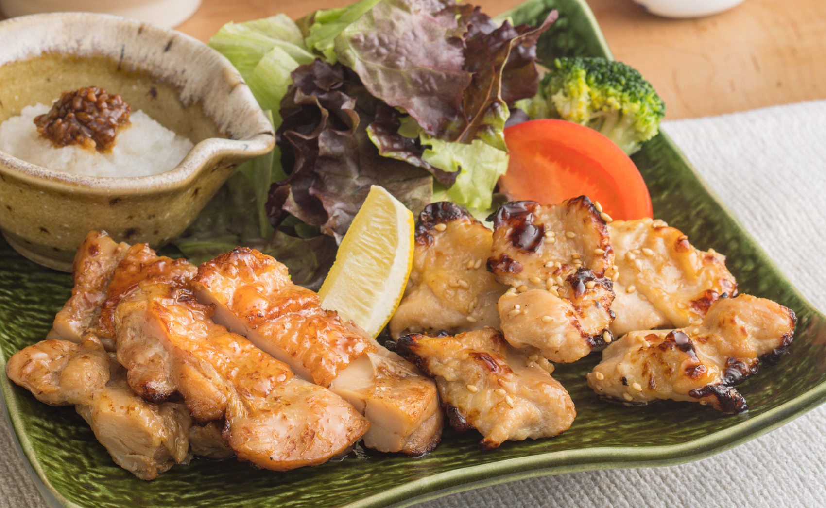 希少部位で旨みのある“肩小肉”を白麹漬けでやさしい味わいにしました。人気のもろみチキンも一緒に楽しめる大戸屋こだわりの炭火焼き(※)の合い盛り定食です。炭火で焼き上げたからこそ味わえる旨みや香ばしさを、醤油麹をのせた大根おろしでさっぱりとお召し上がりください。