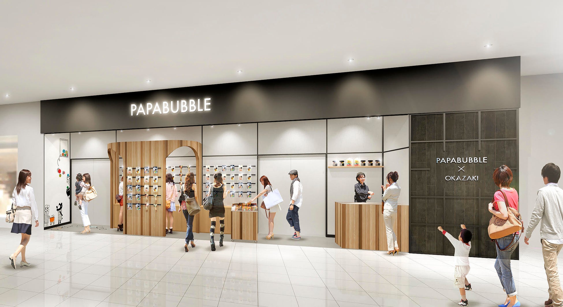 ”パパブブレ × OKAZAKI”は、八丁味噌の工場をモチーフとし、伝統的な焼杉と漆喰の壁、巨大な味噌樽をイメージした岡崎市ならではの店舗デザインを採用。世界中で人気の定番スイーツに加え、八丁味噌を使用したキャンディ、1/3000サイズの岡崎城や、岡崎の名産品の絵柄が組み込まれたキャンディなども発売予定です。