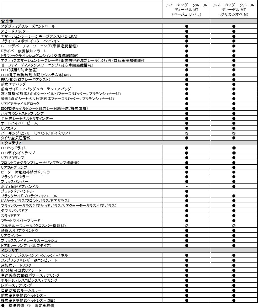 ルノー カングー クルール ディーゼル MTは、フランス、アフリカ、中東の文化が交わるサハラ砂漠の昼と夜の風景をイメージしたベージュとグレーの2色のボディカラーをラインアップし、力強いディーゼルエンジンにヒルスタートアシスト付6速マニュアルトランスミッションを組み合わせたパワートレーンが搭載されています。