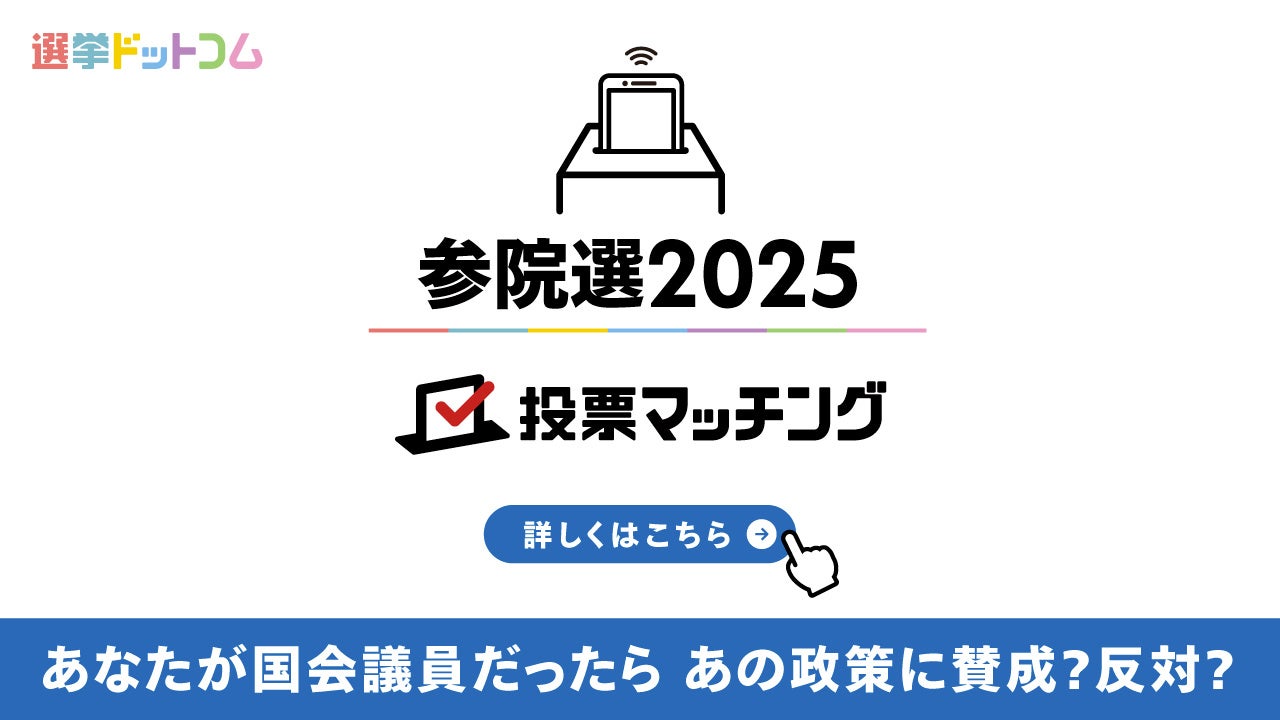 選挙ドットコムを運営するイチニ株式会社(代表取締役社長 高畑卓、東京都渋谷区)は7月4日、「第27回参議院議員選挙2025投票マッチング」(https://votematches.go2senkyo.com/sangiin_2025/)をオープンいたしました。