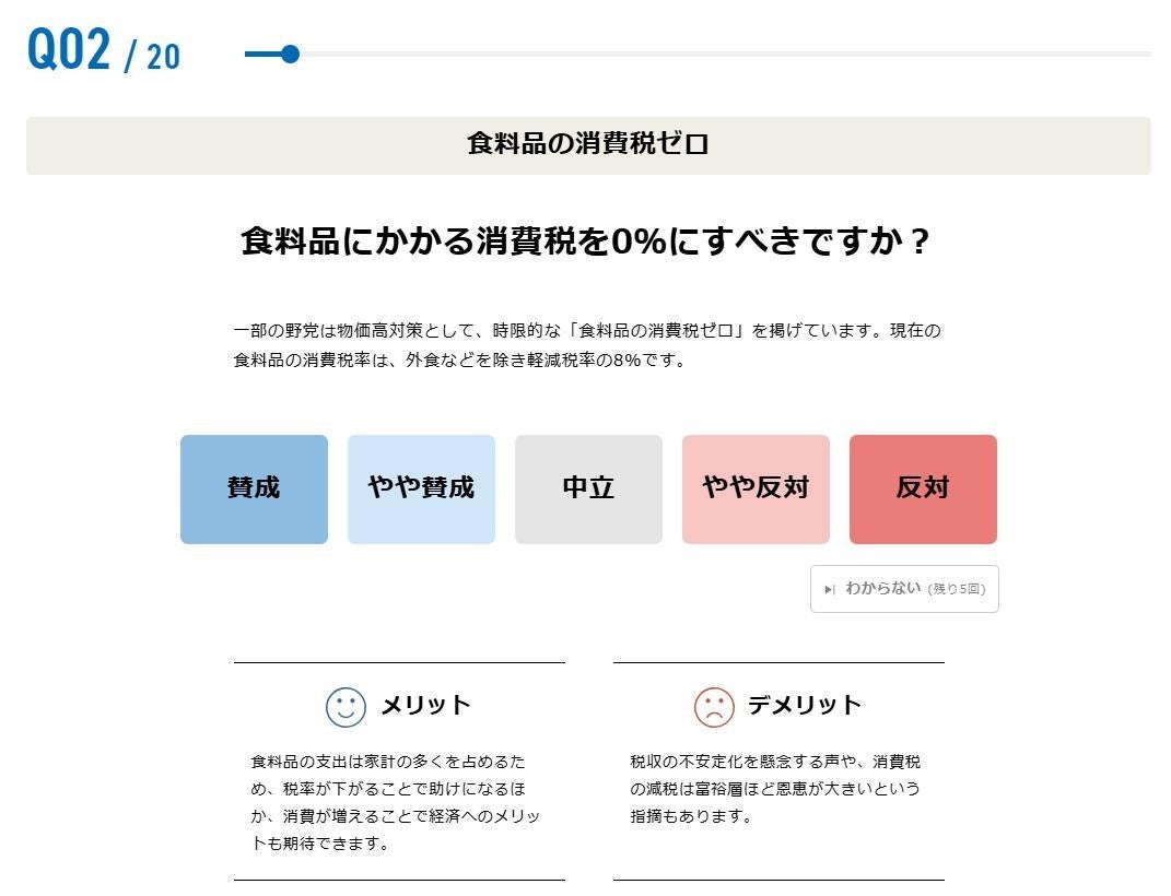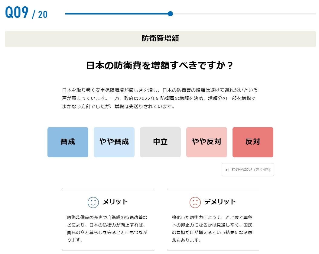 今回の参院選の「争点」として挙げられている現金給付、消費税、防衛費増額など幅広い分野の設問になりますが、全ての質問に概要を説明する「解説文」と「メリット」「デメリット」を記載することで、利用者の判断材料をご提供します。