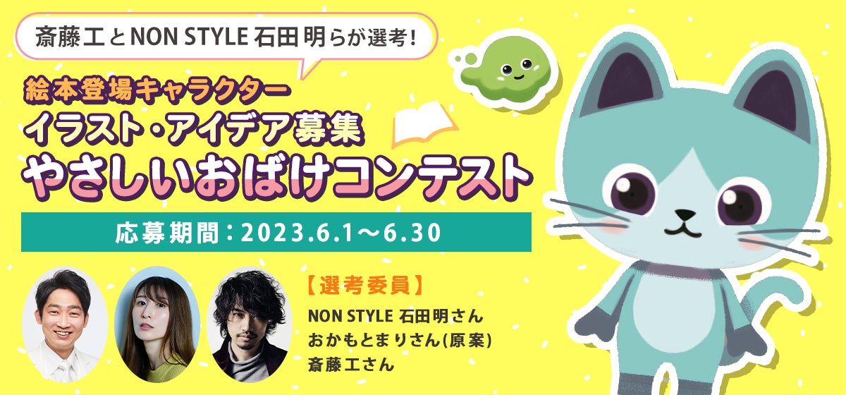 おかもとまり氏が原案を、NON STYLE 石田明氏(以下「石田氏」)が脚本を務め、俳優の斎藤工氏(以下「斎藤工氏」)、タレントの中川翔子氏が声優を務めたYouTubeアニメ「ウシガエルは、もうカエル。」のスピンオフ企画の絵本化(以下「本絵本」)に合わせて、 当絵本内に登場する「やさしいおばけ」のキャラクターデザインを募集するコンテスト(イラスト部門・アイデア部門)となります。